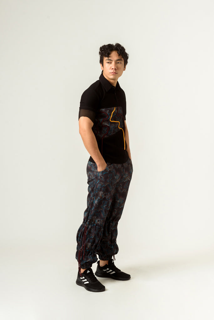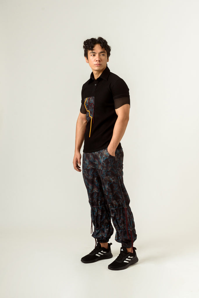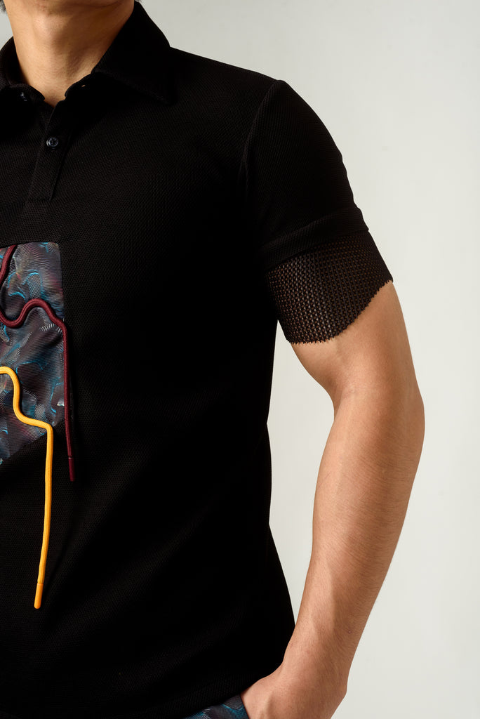 The fitted black poly knit texture crepe T-shirt features agitation print patch in poly lycra with hand embroidered orange cord. The sleeves are extended in mesh adding a unique detail. It has front opening and can be paired with agitation print cargo trousers.