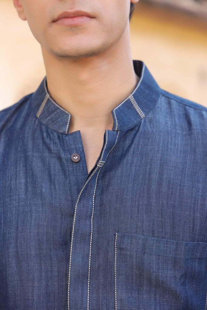 This handcrafted denim kurta shirt is made using sustainable tencel fabric. It comes with a front button placket with mandarin collar, wooden buttons, and contrast thread work. Pair it up with our tencel denim pants to complete the look.