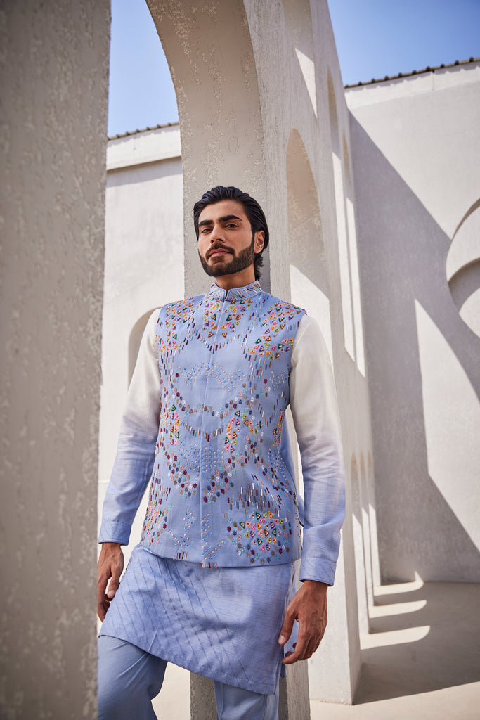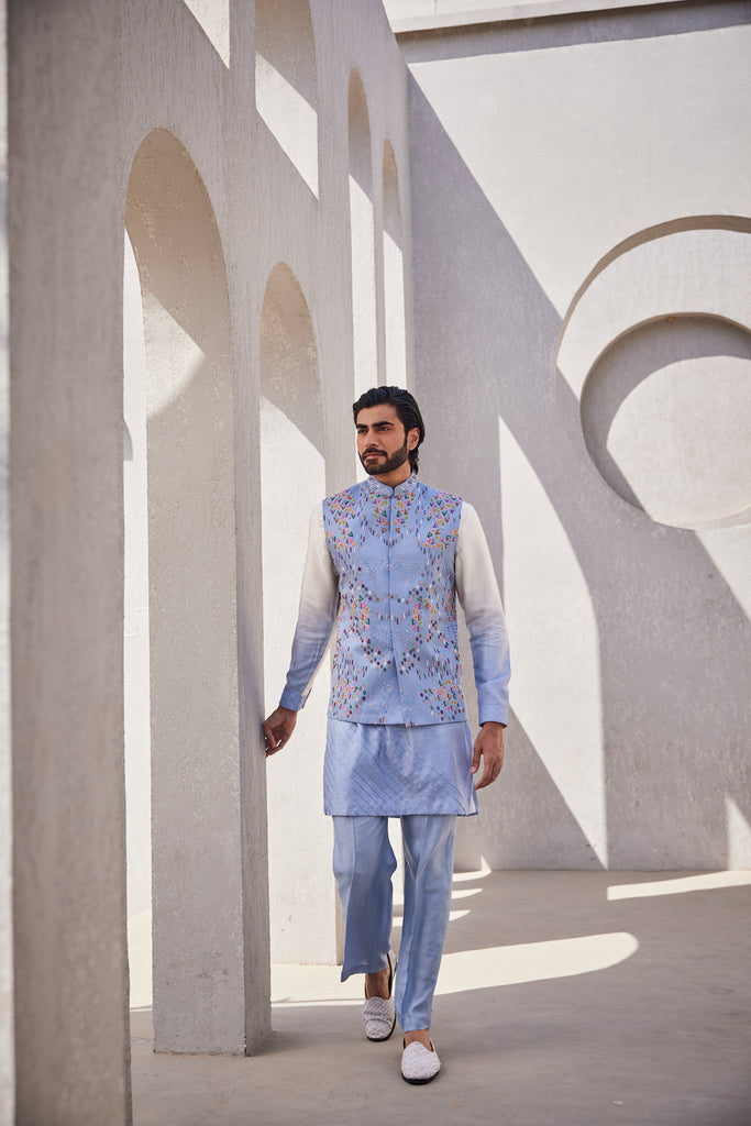 A gentle ombre in frost blue, layered with subtle texture this kurta set feels like walking through a winter dream wrapped in love.