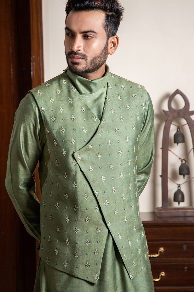 Green side cut silk jacket with all over hand embroidery paired with a cowl neck kurta with side drape. This comes with a contrast beige churidar.