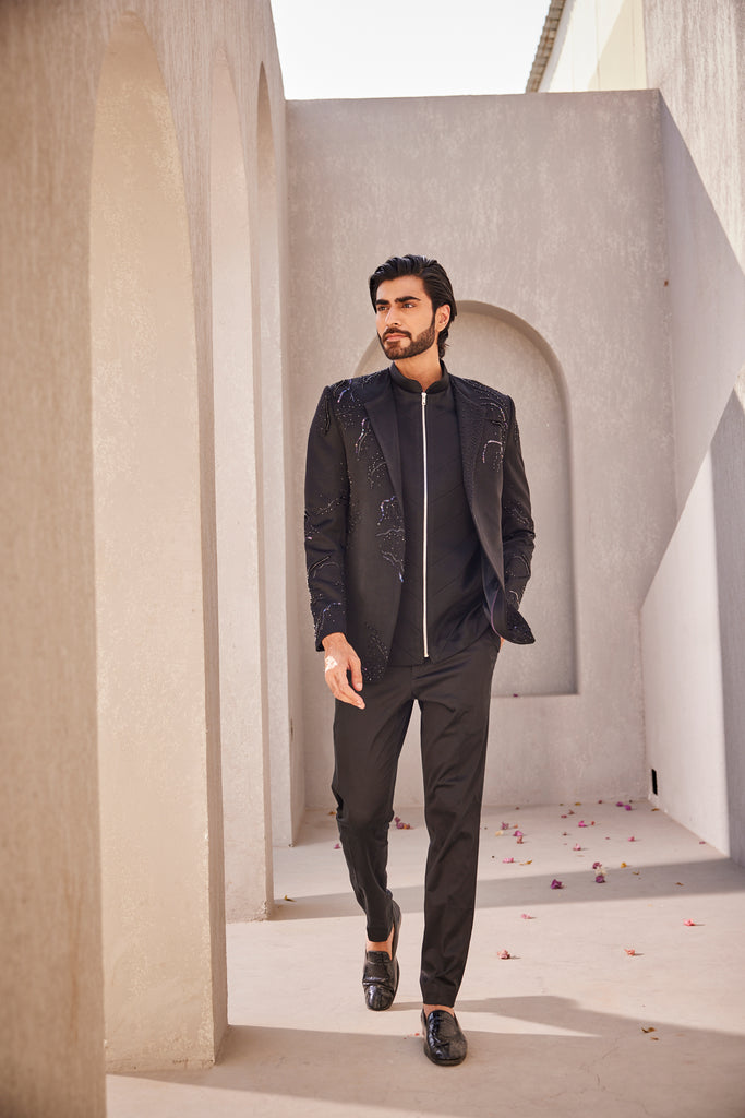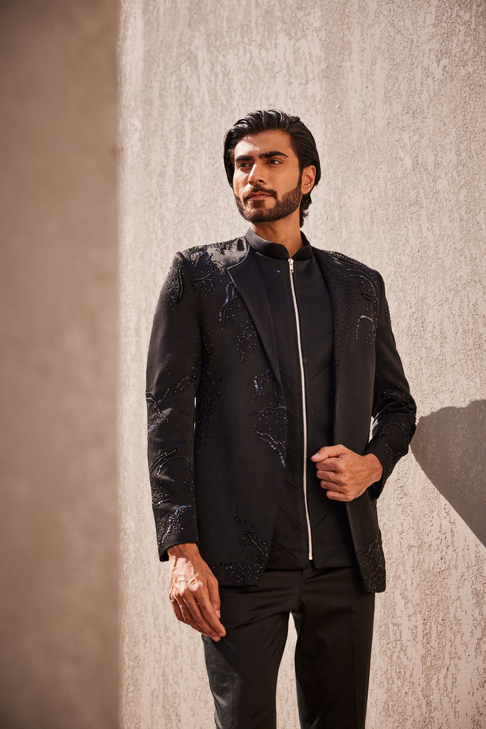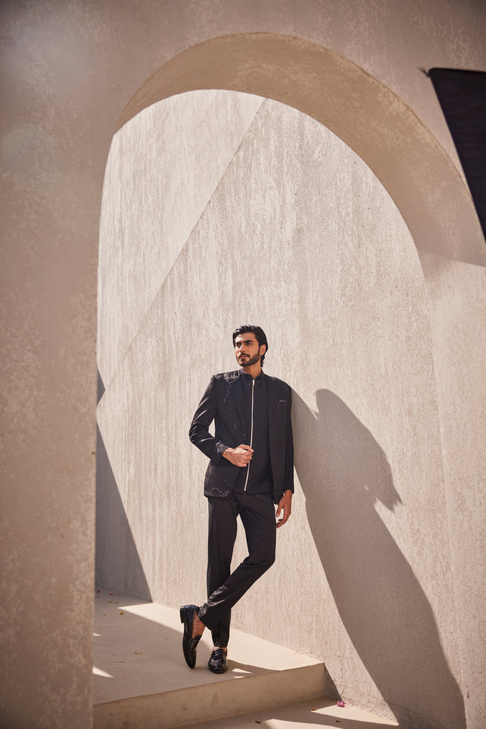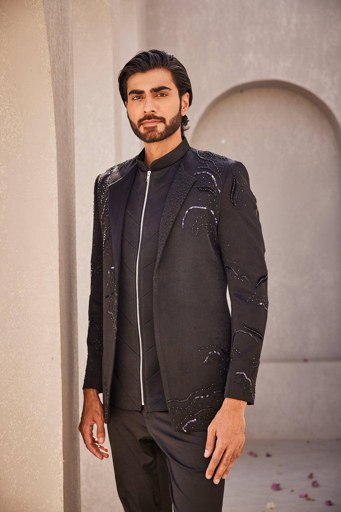 This refined indowestern touched with Silver zip, subtly lined with blush with lines of snowflakes. Snowfall of Love where classic tailoring flirts with winter romance.