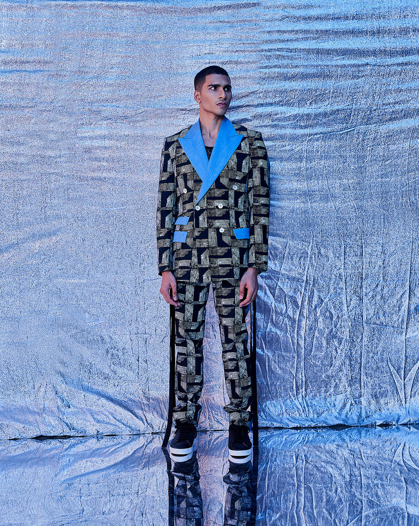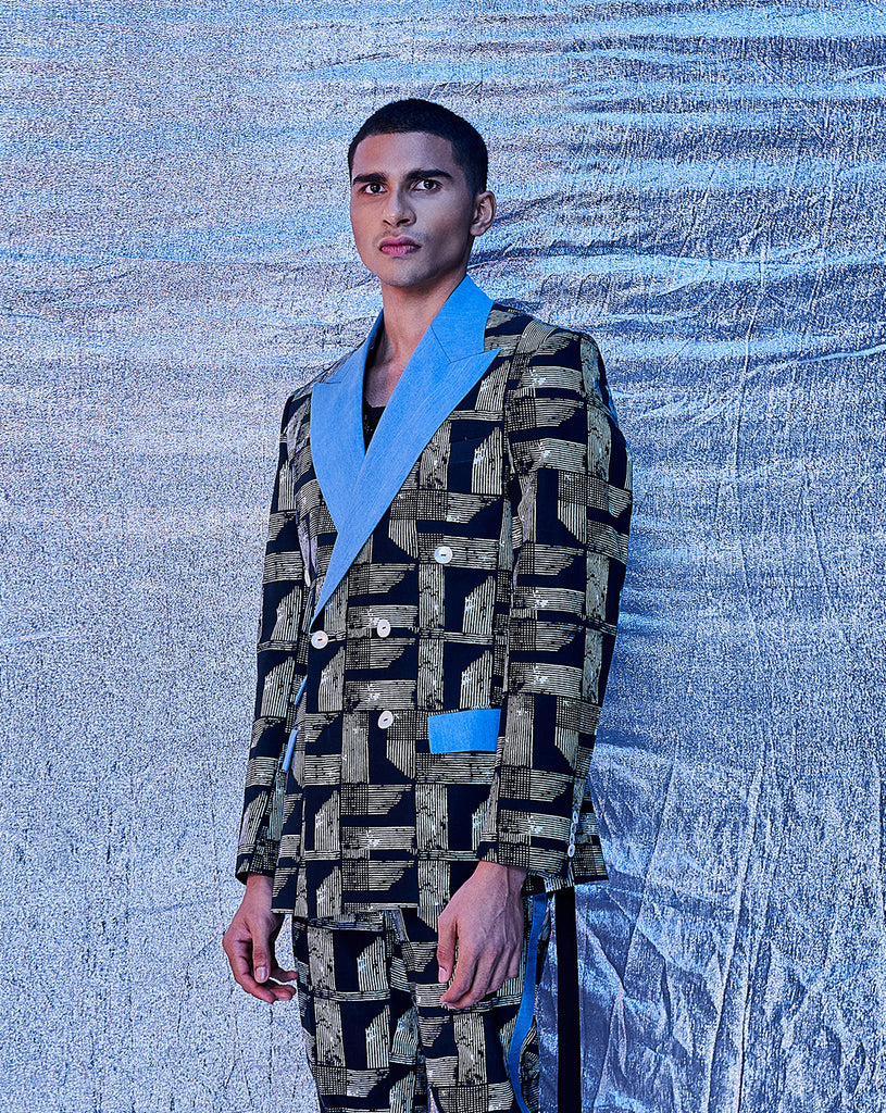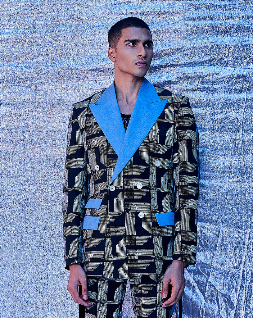 Modern day print tuxedo with contrast blue denim lapel and pocket flaps.