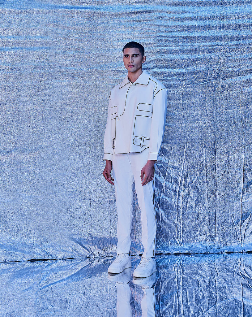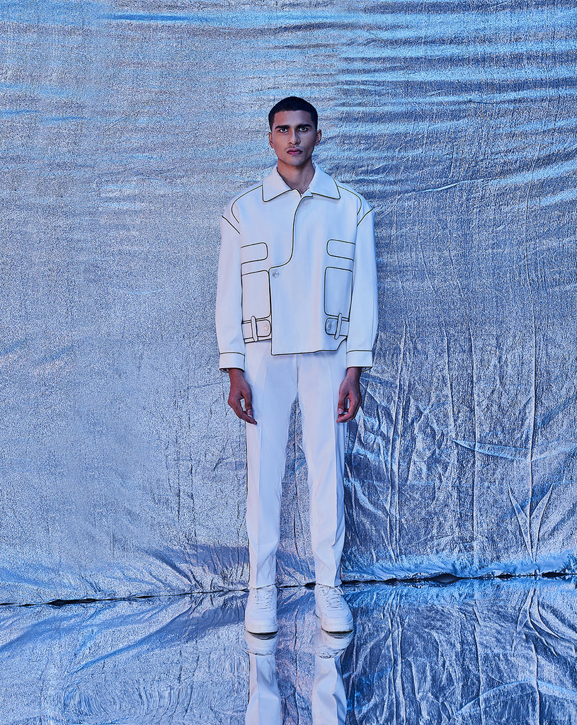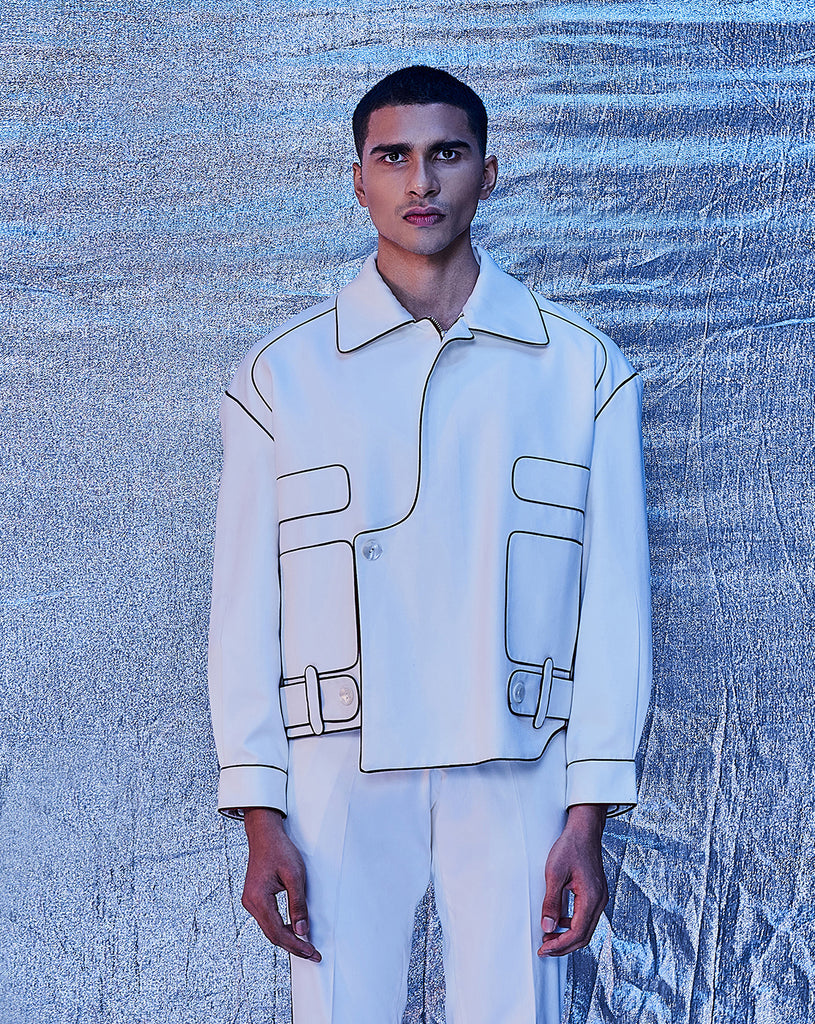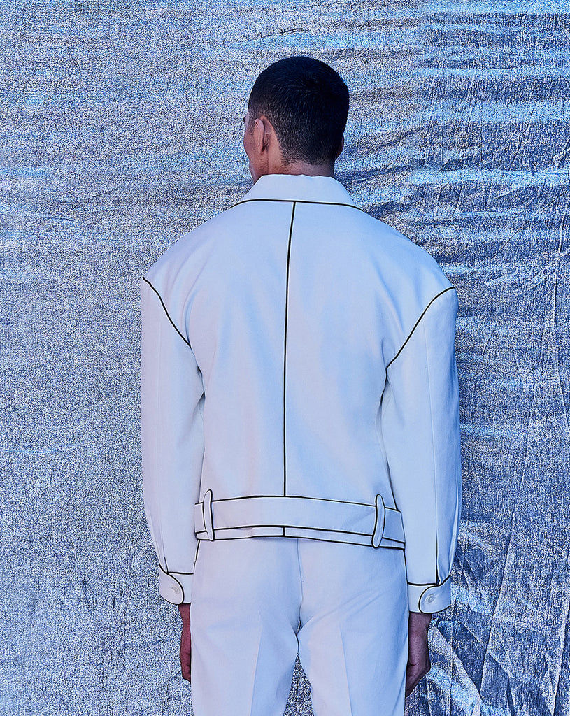 Off-white boxy asymetrical bomber jacket with rust piping and patchwork detail.