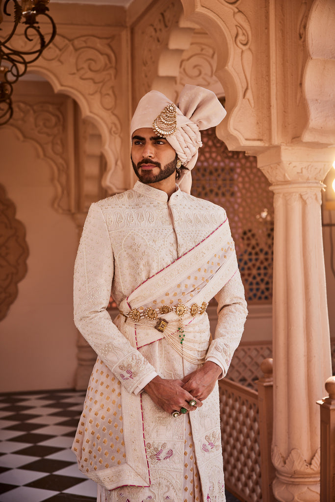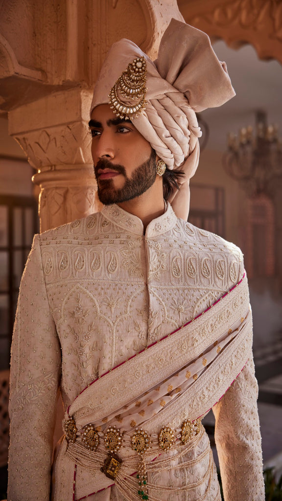 In hues of soft rose petal pink, this sherwani becomes a canvas of royal wilderness graced with resham-embroidered elephants, peacocks, and deer. Each motif tells a tale of strength, grace, and serenity, echoing nature harmony and the soul of a groom grounded in heritage yet carried by love.