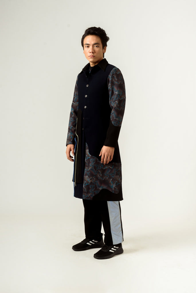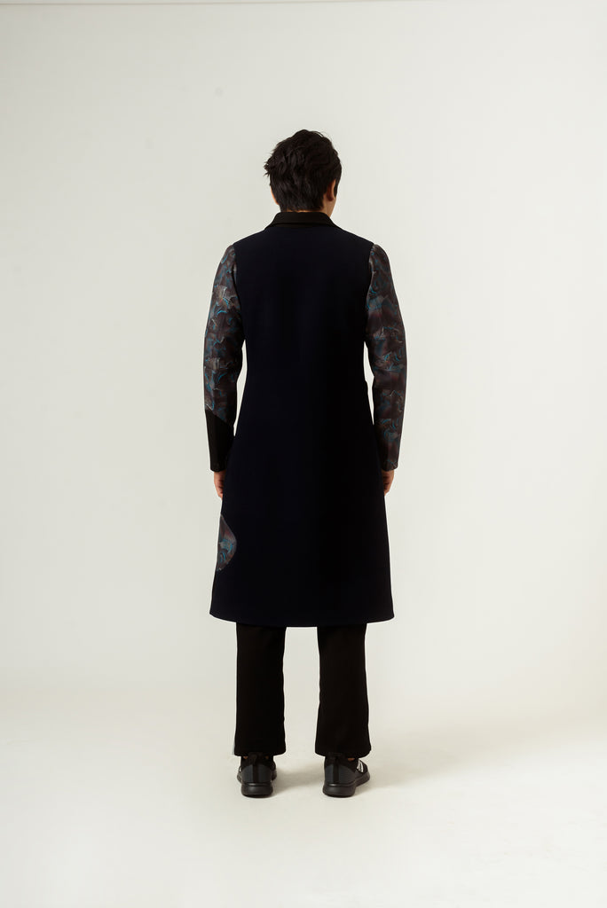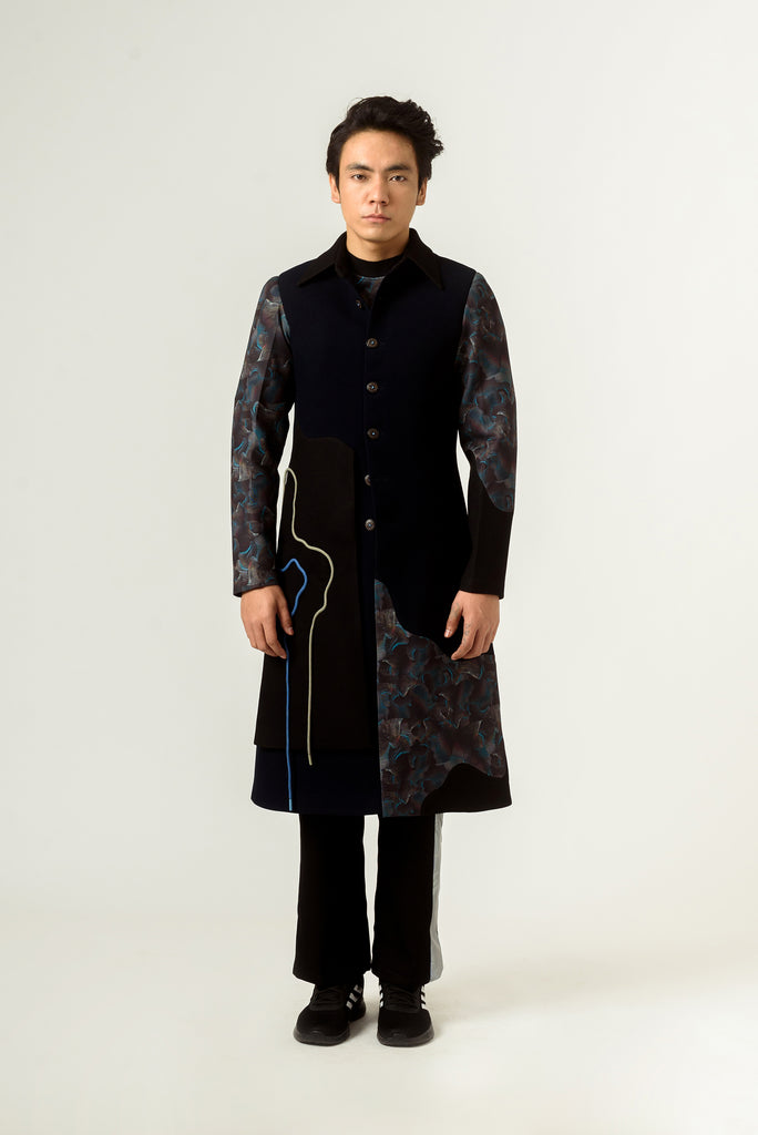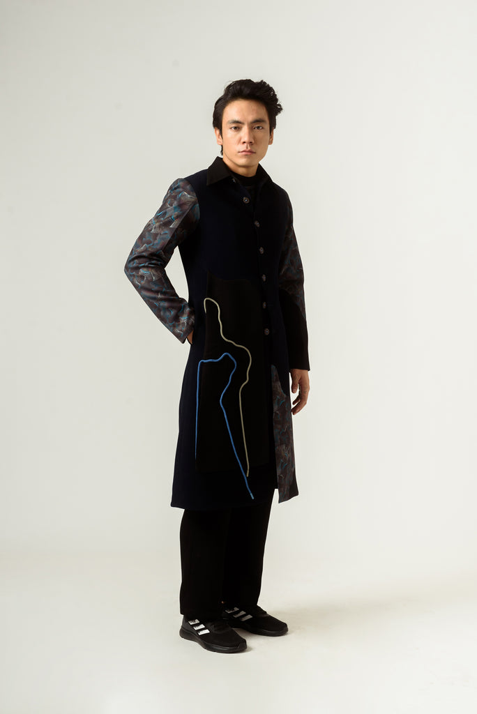 Trench coat makes you look so smart and poised. This one in navy blue is cut out from textured crepe. It has panels of agitation print in lycra. The black in knit crepe adorned with hand-embroidered rope. It has pockets on sides and front button opening.