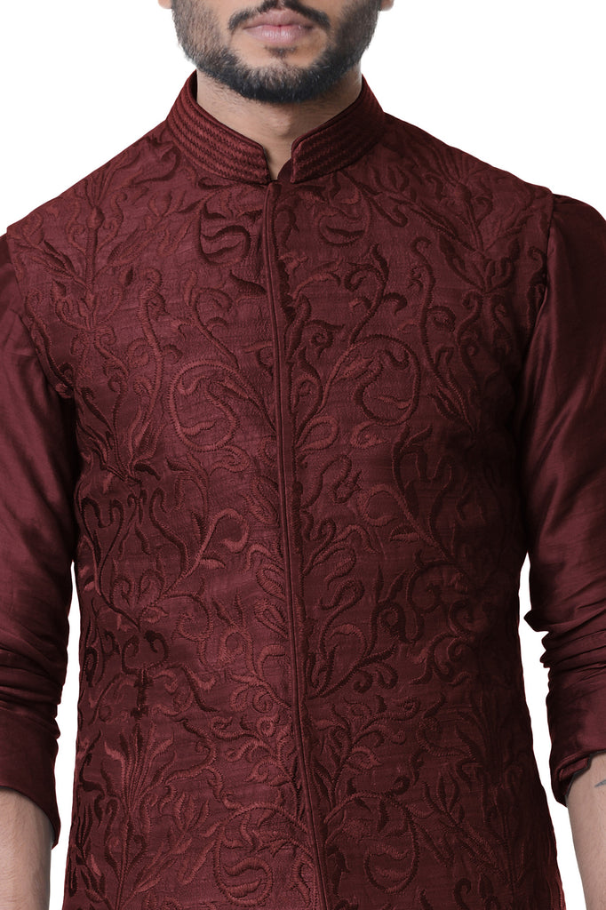 Featuring a Wine cowl kurta with wine waist coat set with full embroidery