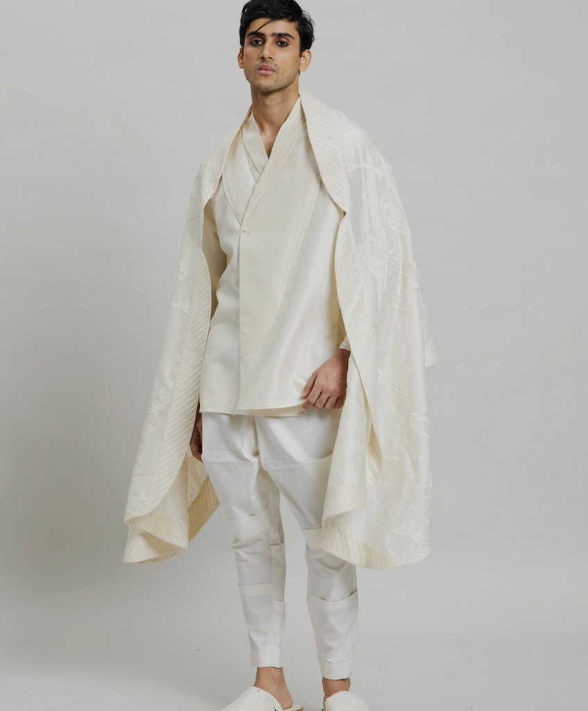 A hybrid between a shirt and a jacket, made from cotton silk for a structured yet comfortable fit. A luxurioushawl featuring intricate designs. Stylish pleated trousers .