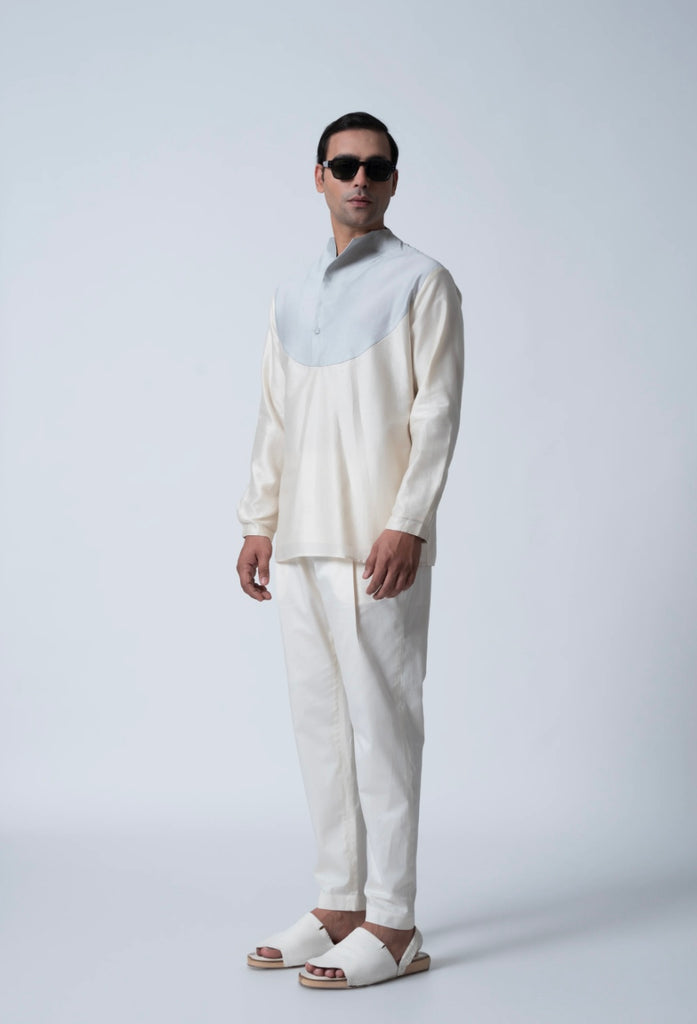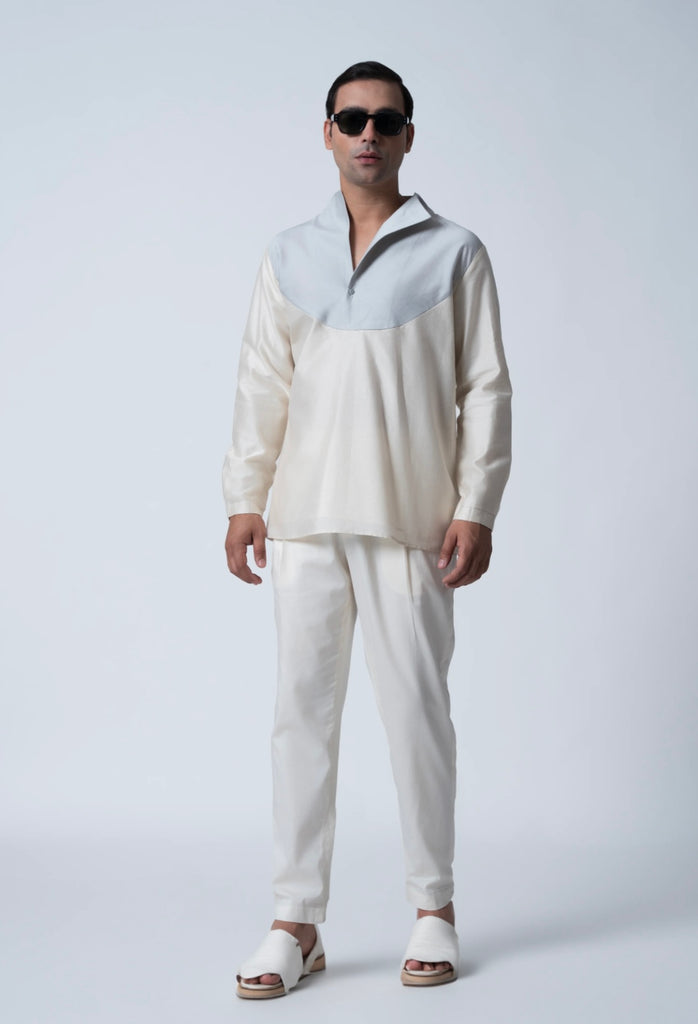 The Ray Top is a relaxed-fit garment crafted from cotton silk, offering a breathable and elegant feel. It comes in ivory and ice blue, with customization options available