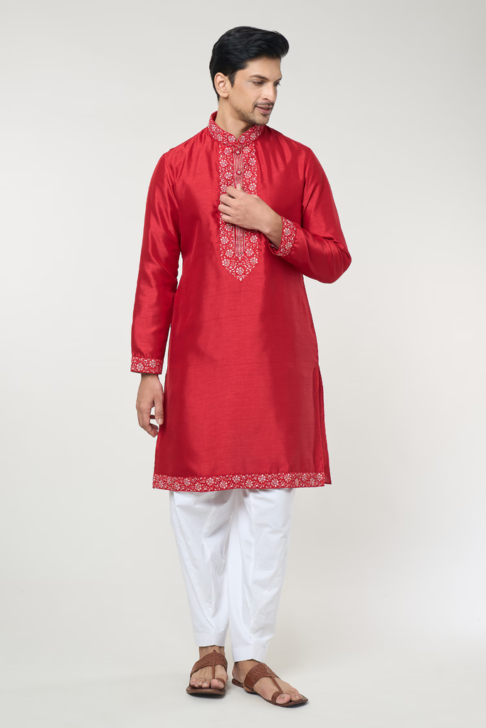 Cherry Red cotton silk based kurta, enhanced with floral thread and sequin emroidery, paired with an off white cotton based pathani pants.