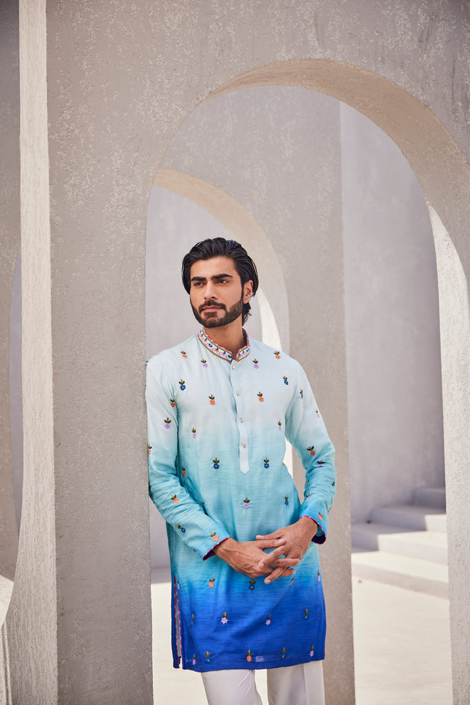 Tailored in frost blue ombre, this kurta mirrors the elegance of winter dawn clean, calm, and quietly captivating.