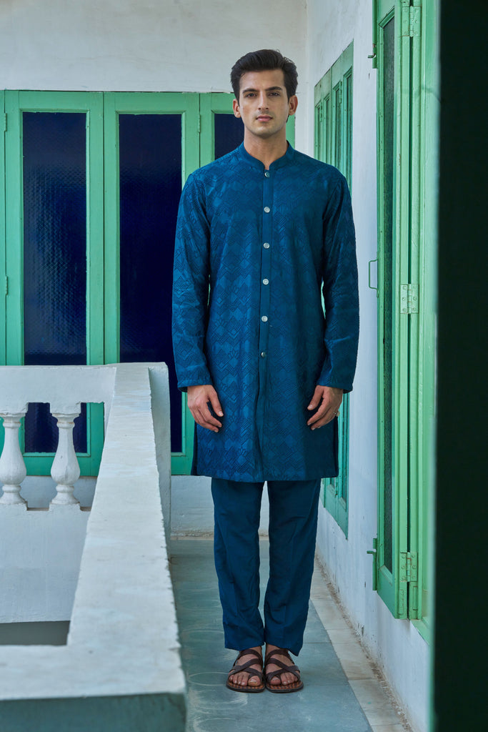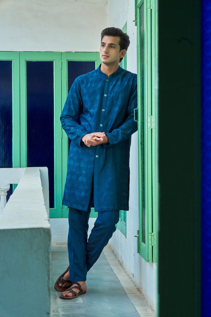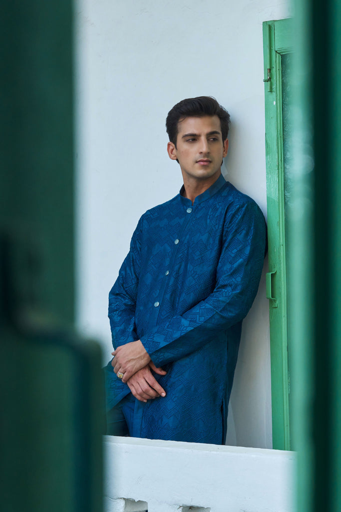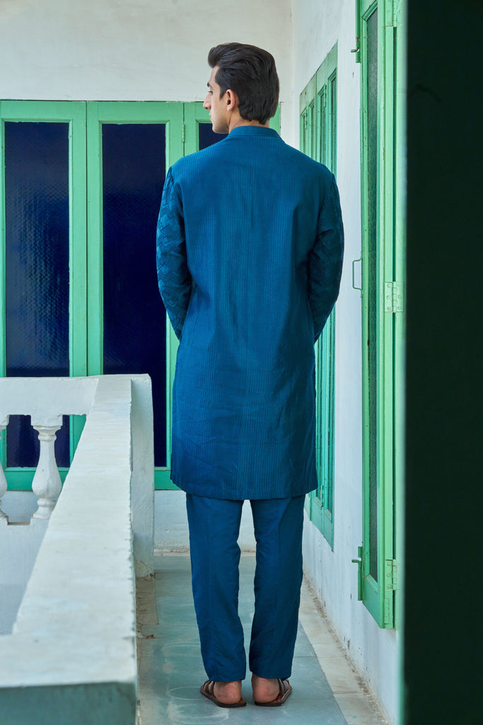 A cobalt silk kurta set with intricate embroidery, featuring a front-open design that combines both elegance and ease. Paired with tonal blue trousers, this ensemble is a modern twist on classic luxury. The rich cobalt hue and delicate craftsmanship make it perfect for a stylish evening affair.