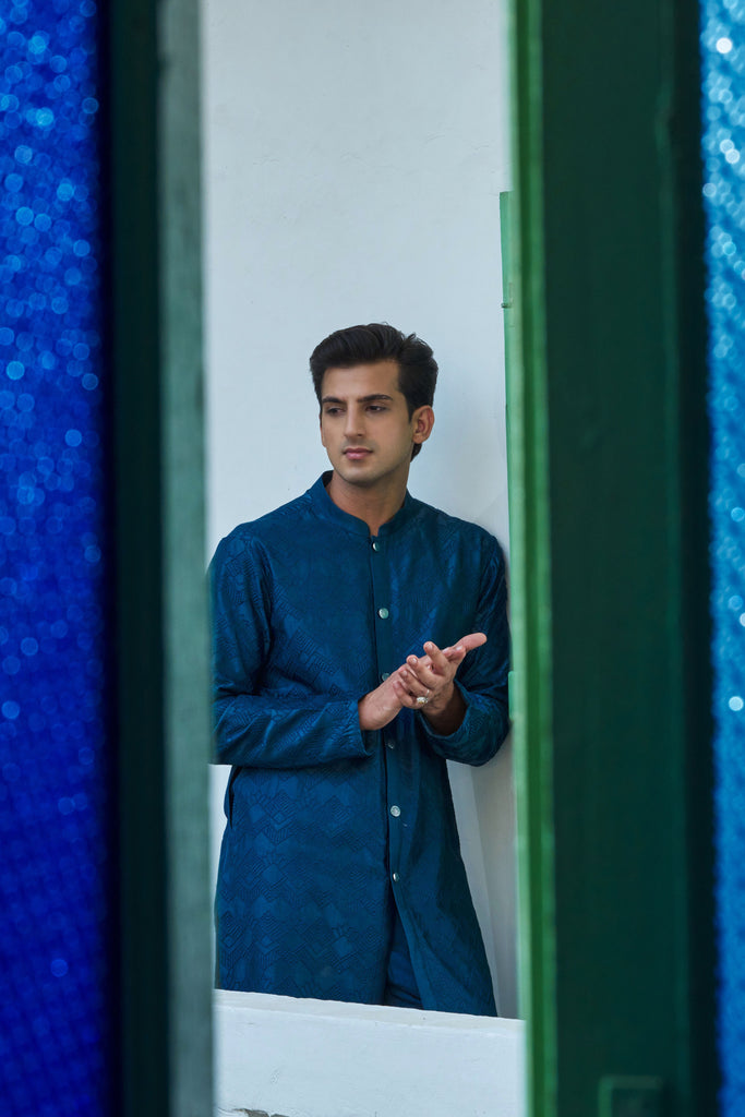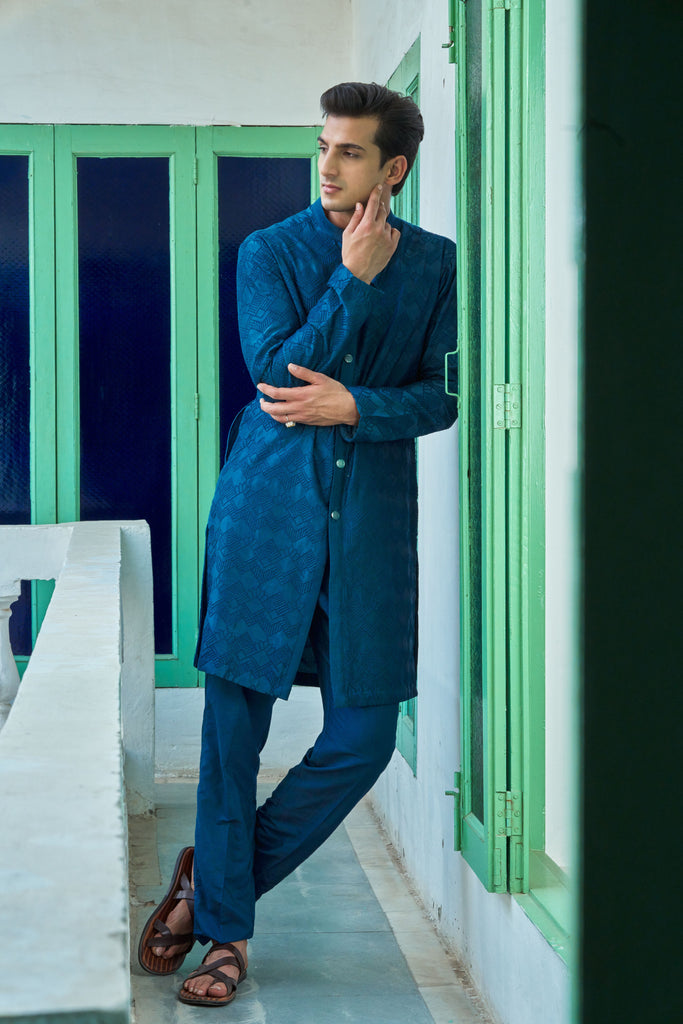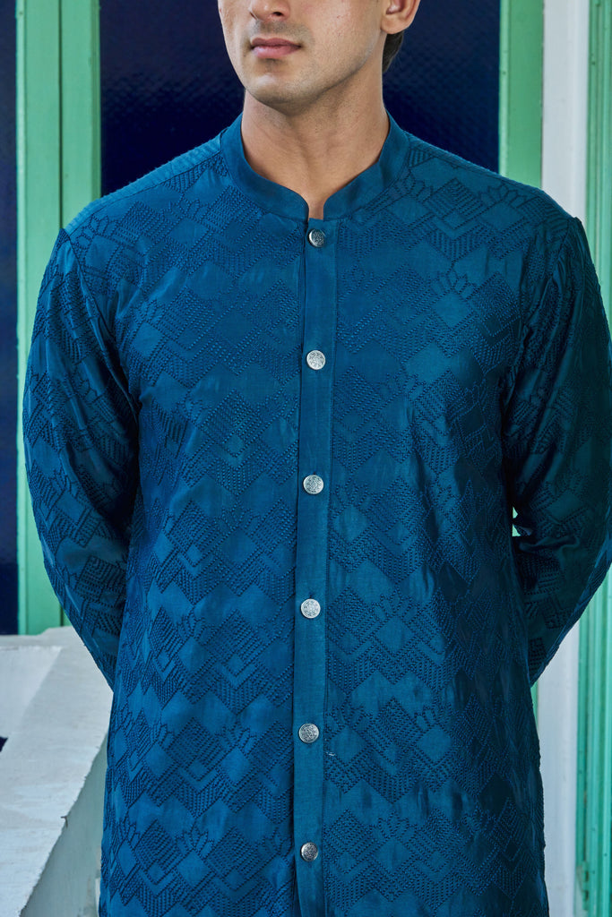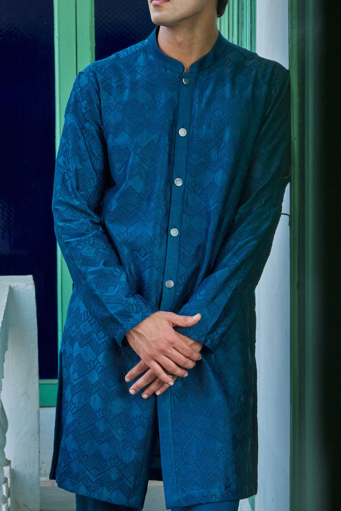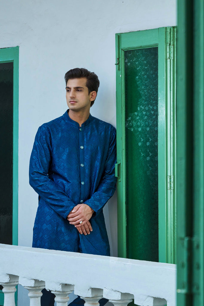 A cobalt silk kurta set with intricate embroidery, featuring a front-open design that combines both elegance and ease. Paired with tonal blue trousers, this ensemble is a modern twist on classic luxury. The rich cobalt hue and delicate craftsmanship make it perfect for a stylish evening affair.