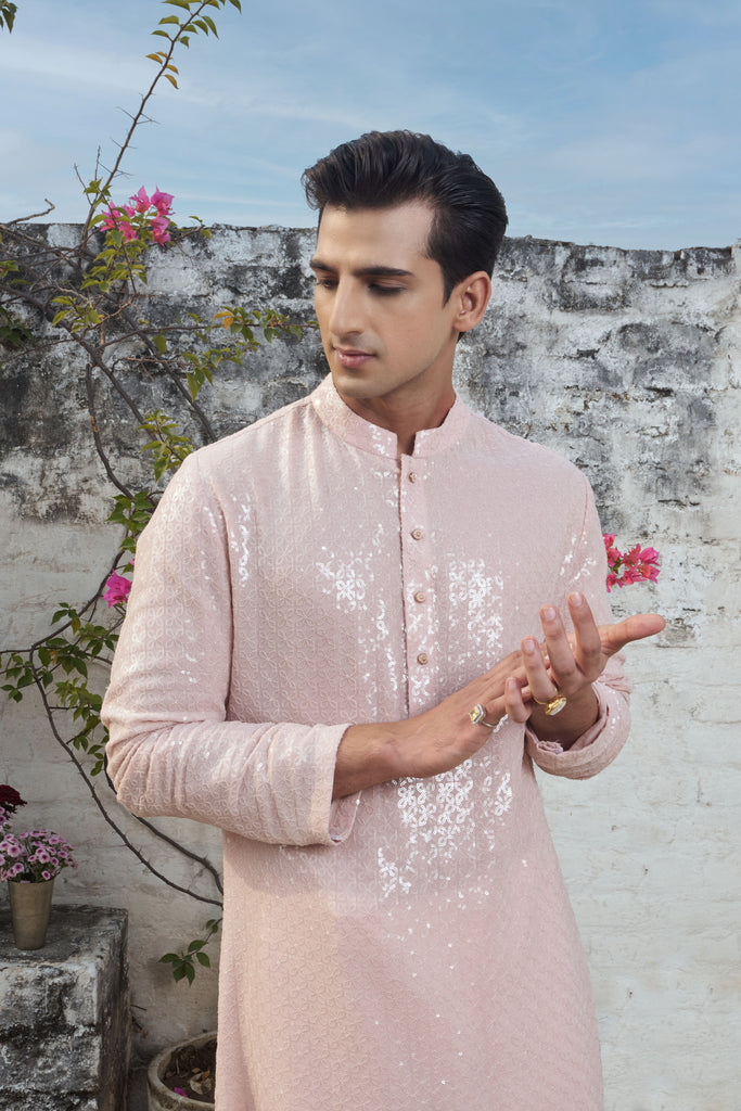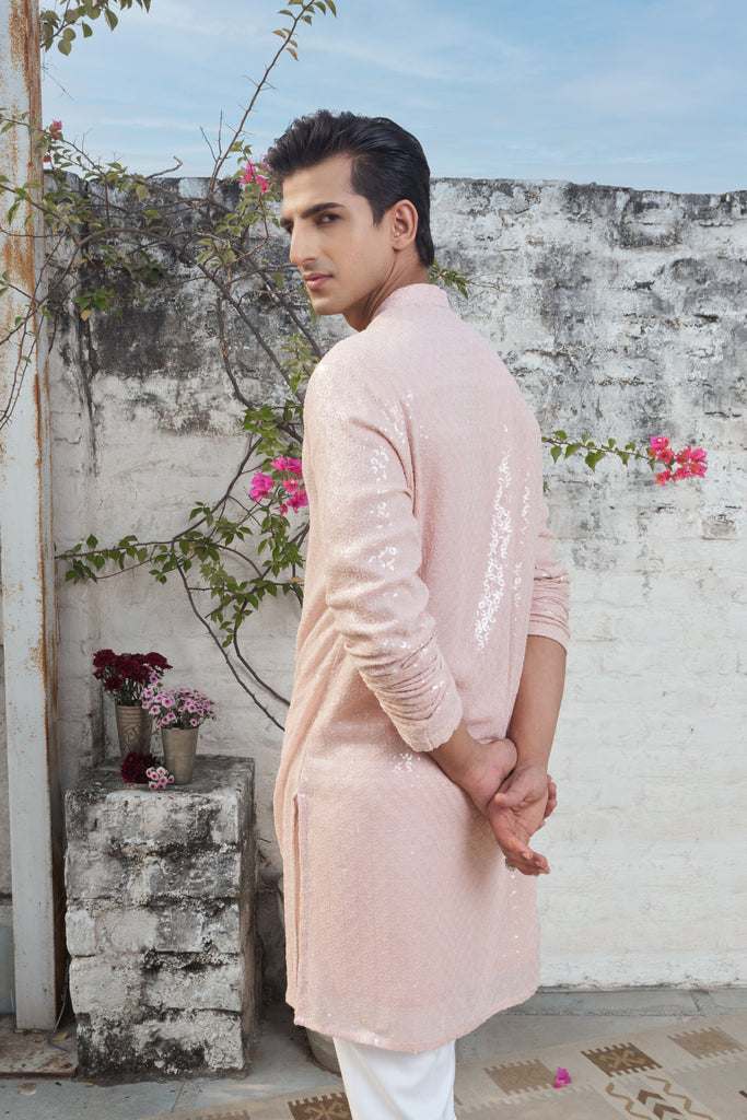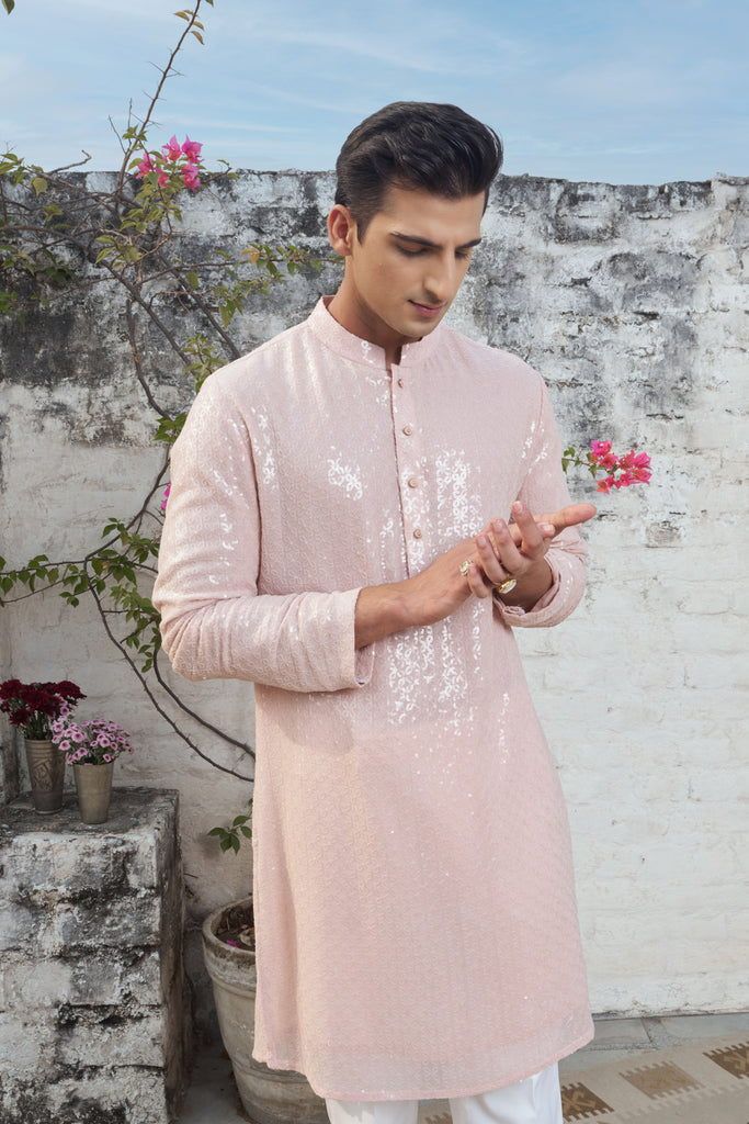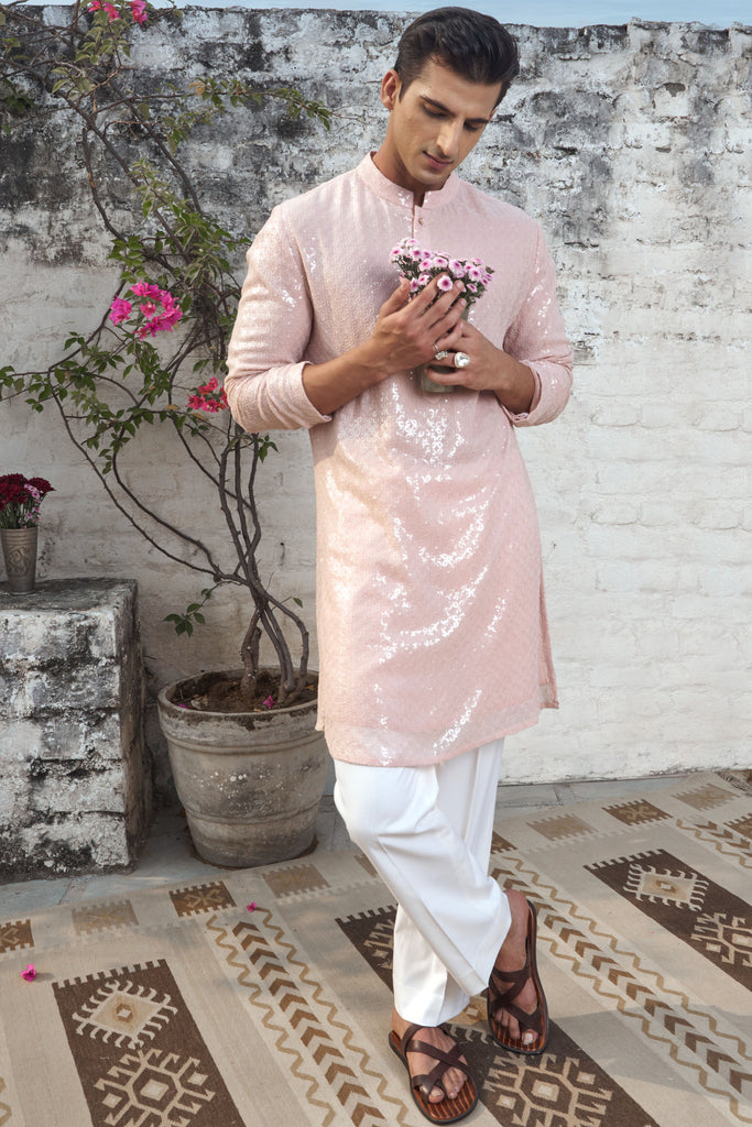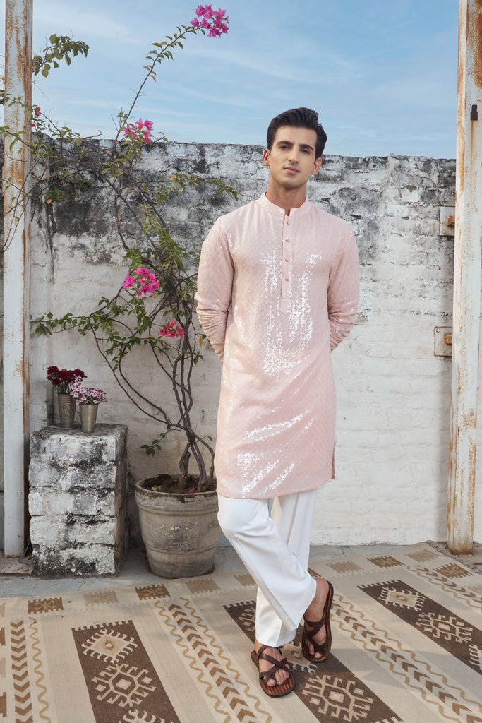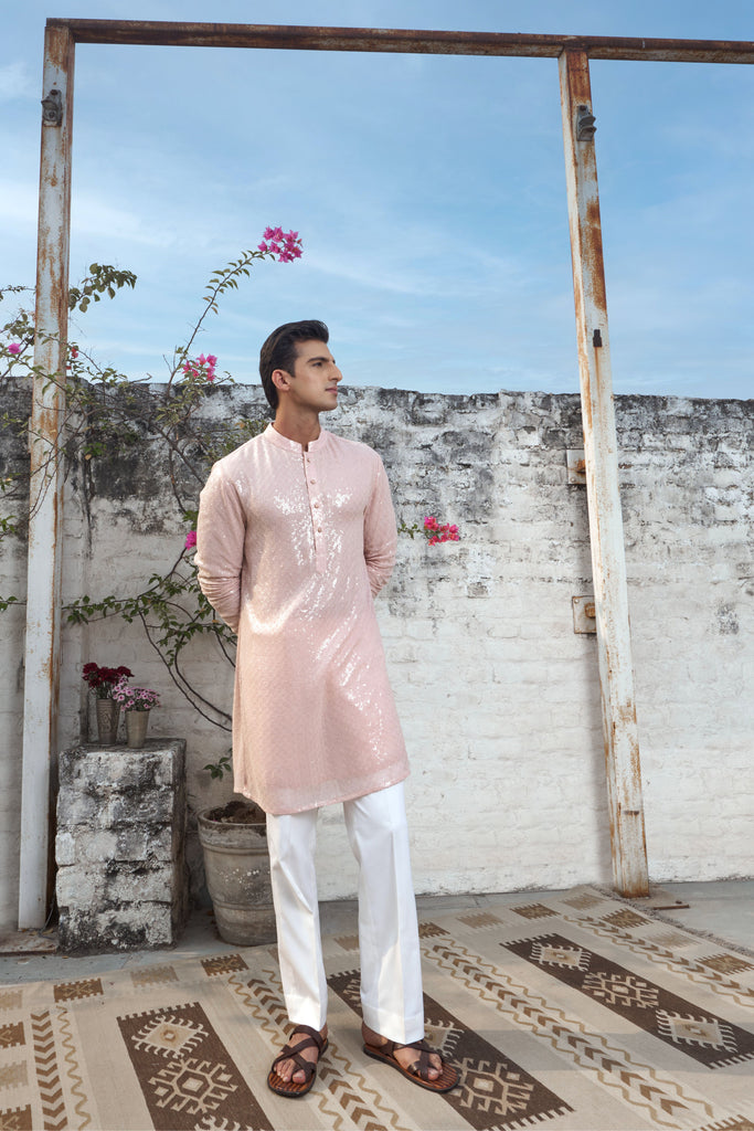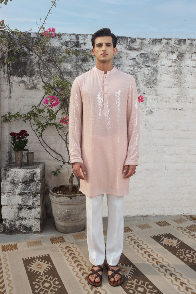 A light pink sequin kurta that captures the essence of understated glamour. Its delicate sequins shimmer like stardust, creating a look that is both ethereal and captivating. Best paired with white trousers