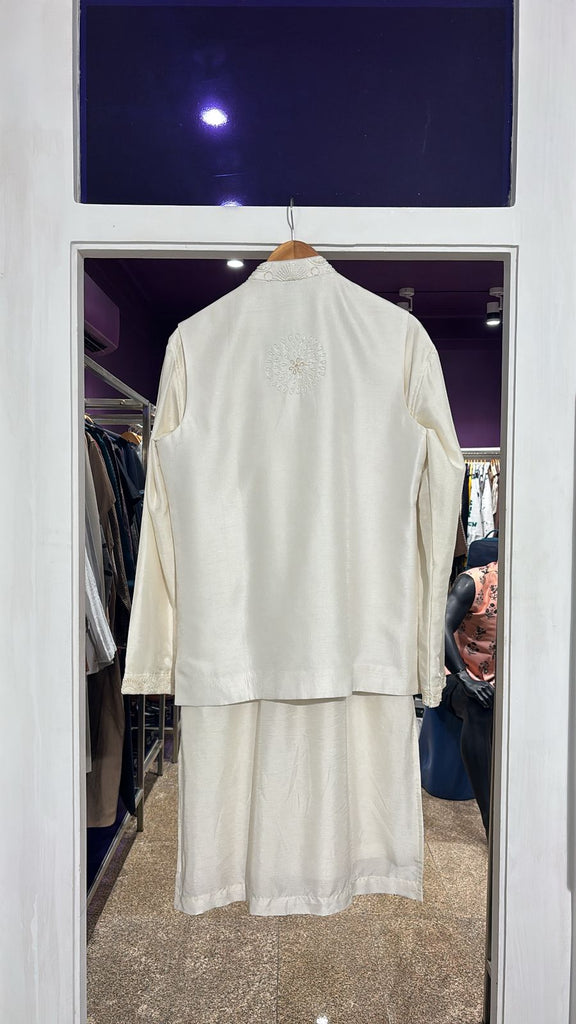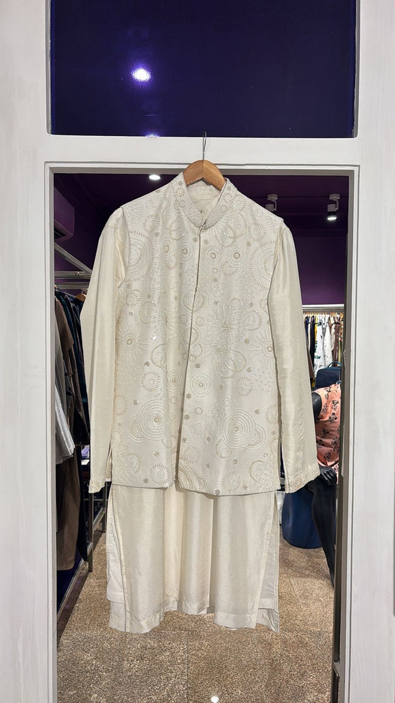 This standout WHITE Bandi Kurta set features a heavily embroidered bandi with abstract cutdana work, offering a bold and luxurious feel. The kurta underneath is designed with a subtle cutdana neckline, adding a touch of shimmer without overpowering the look. Ideal for festive evenings and special occasions where modern elegance meets tradition.