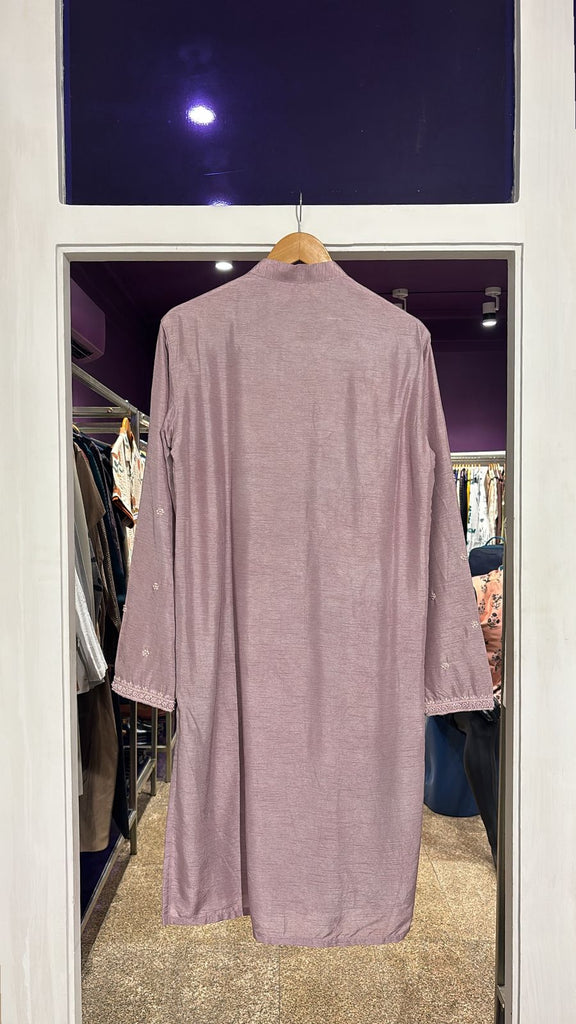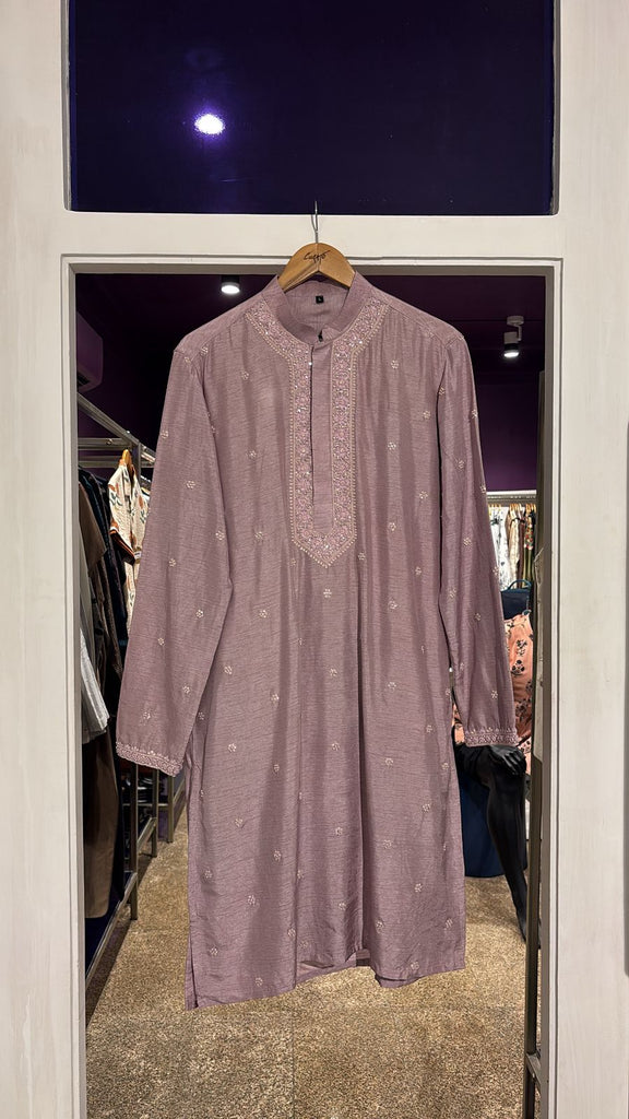 This sophisticated kurta features intricate hand embroidery on the neckline, adding an artisanal touch to the ensemble. The full body of the kurta is adorned with subtle embroidered bootis, creating a graceful and timeless look perfect for both festive and formal occasions.