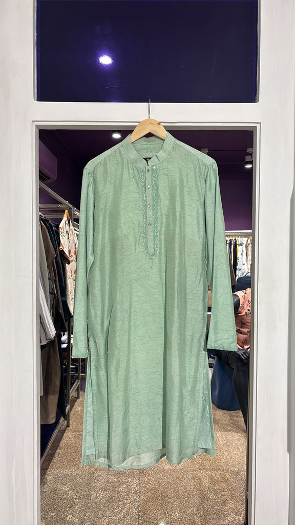 This elegant kurta set comes in a refreshing mint green hue, featuring delicate work along the neckline. The embellishment is crafted using shimmering sequins and classic moti (pearls), adding a touch of subtle glamour while maintaining a refined and sophisticated look.