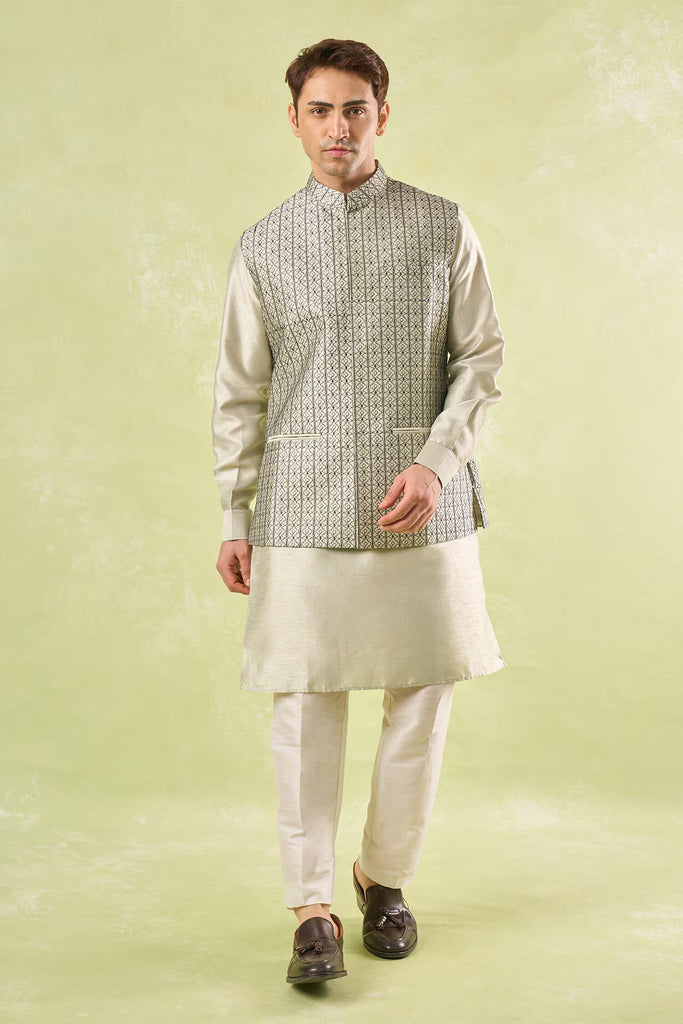 Beige raw silk based jacket enhanced with thread embroidery paired with an off white dupion silk based kurta and an off white dupion silk based mexican pants.
