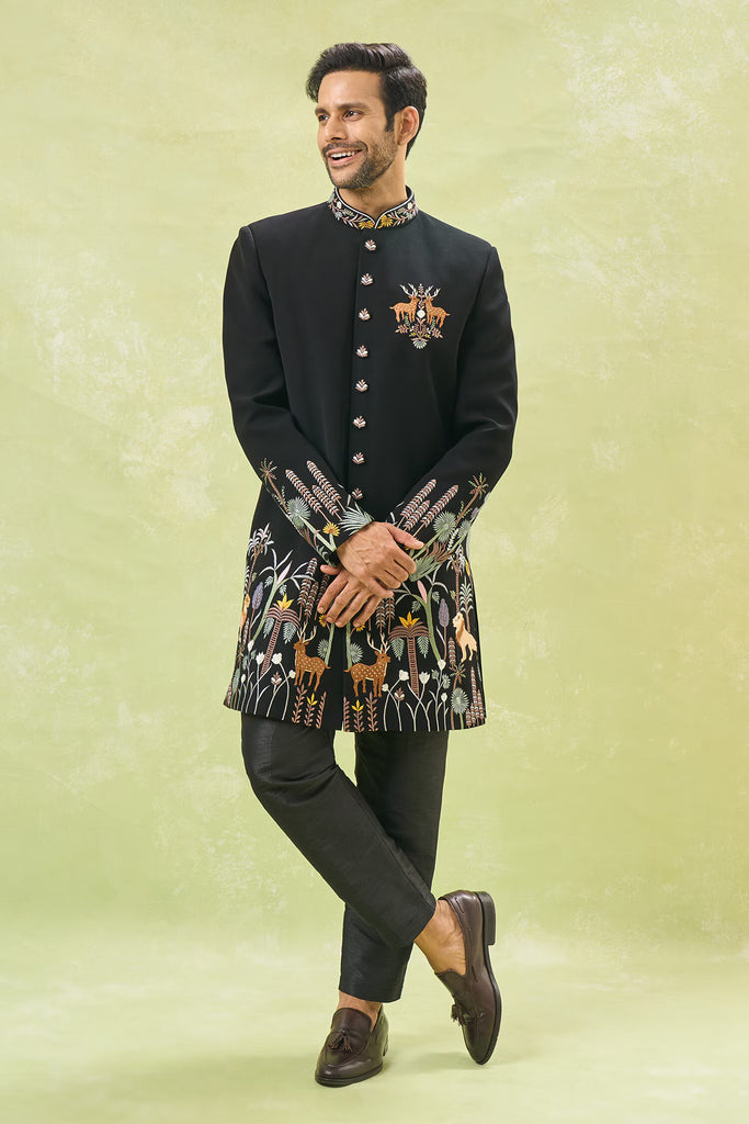 Black terry silk based achkan enhanced with wildlife resham embroidery, paired with a matching dupion silk based pants.