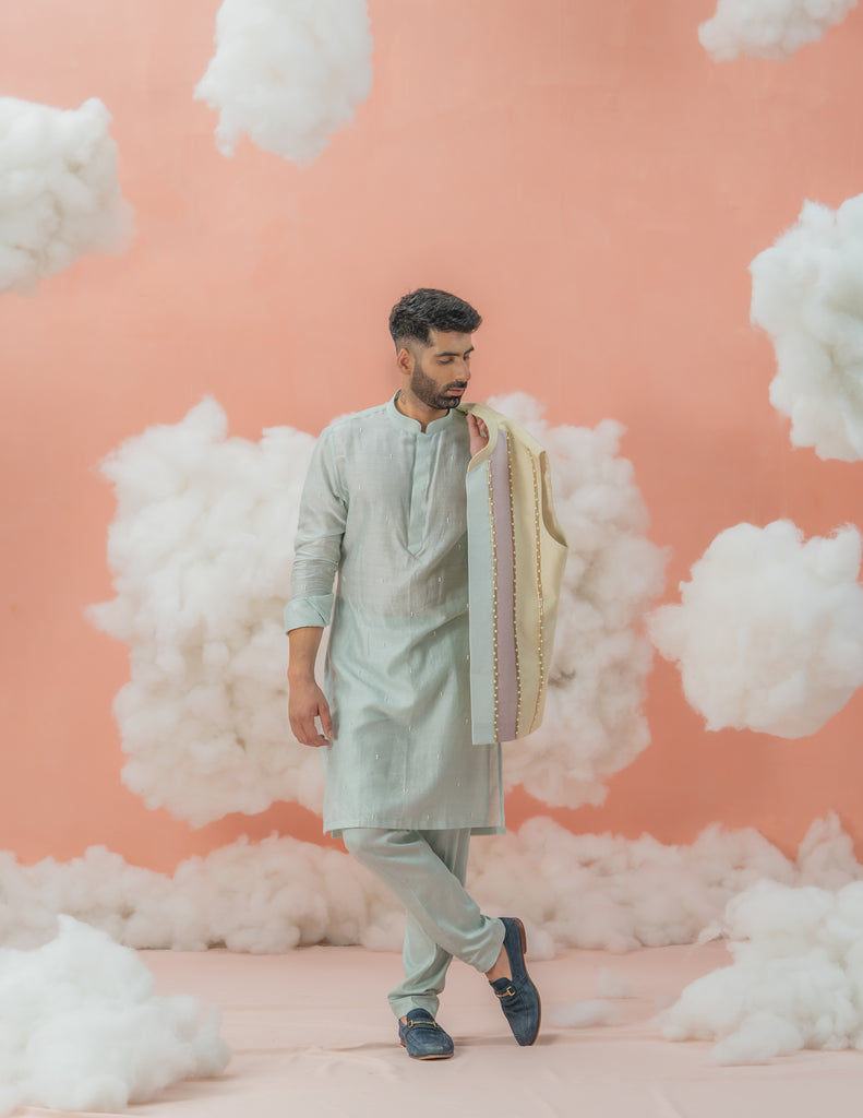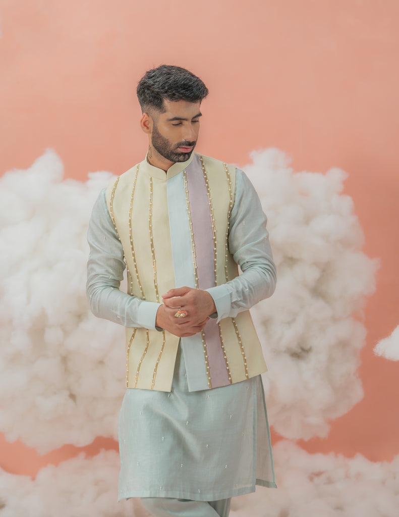 This long, blue kurta set is light and breezy with the use of silk adding a sheen, making it sophiticated and subtle to pair up with our Cutpipe colorblock patch bundi . The colors in the bundi contrast with the subtleness of the kurta set uplift the overall appeal.