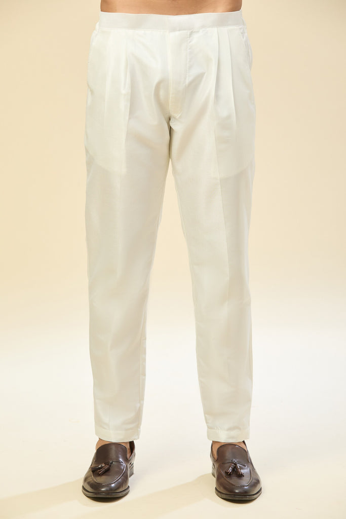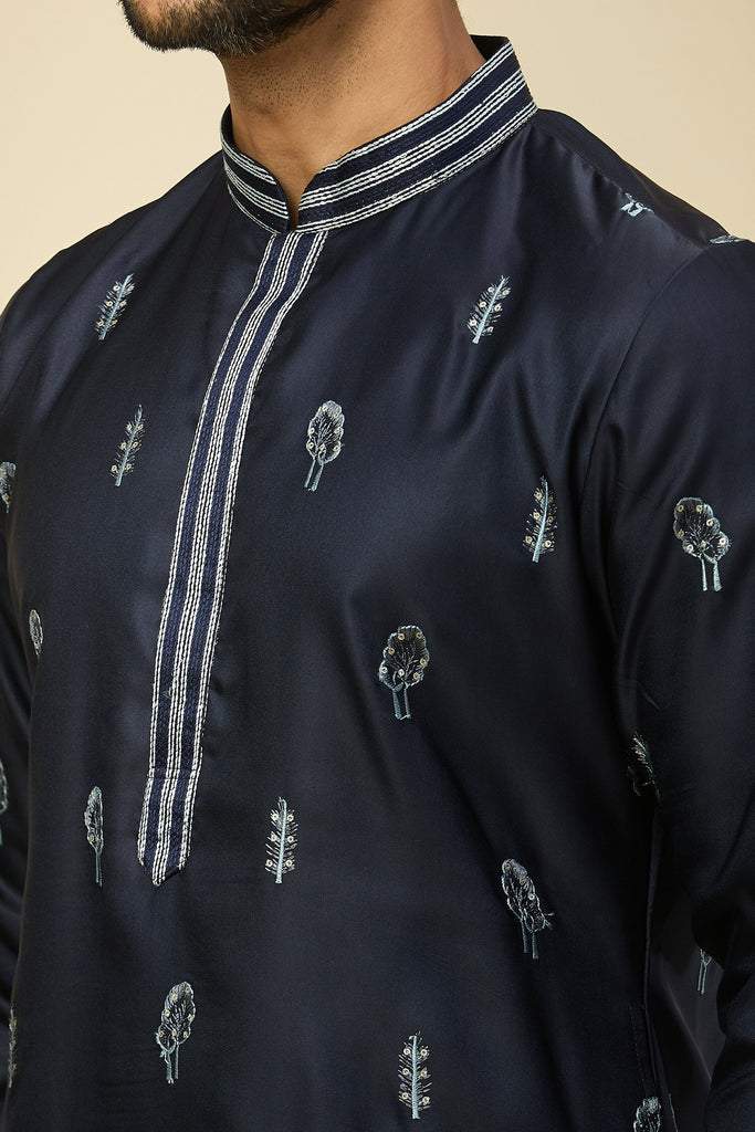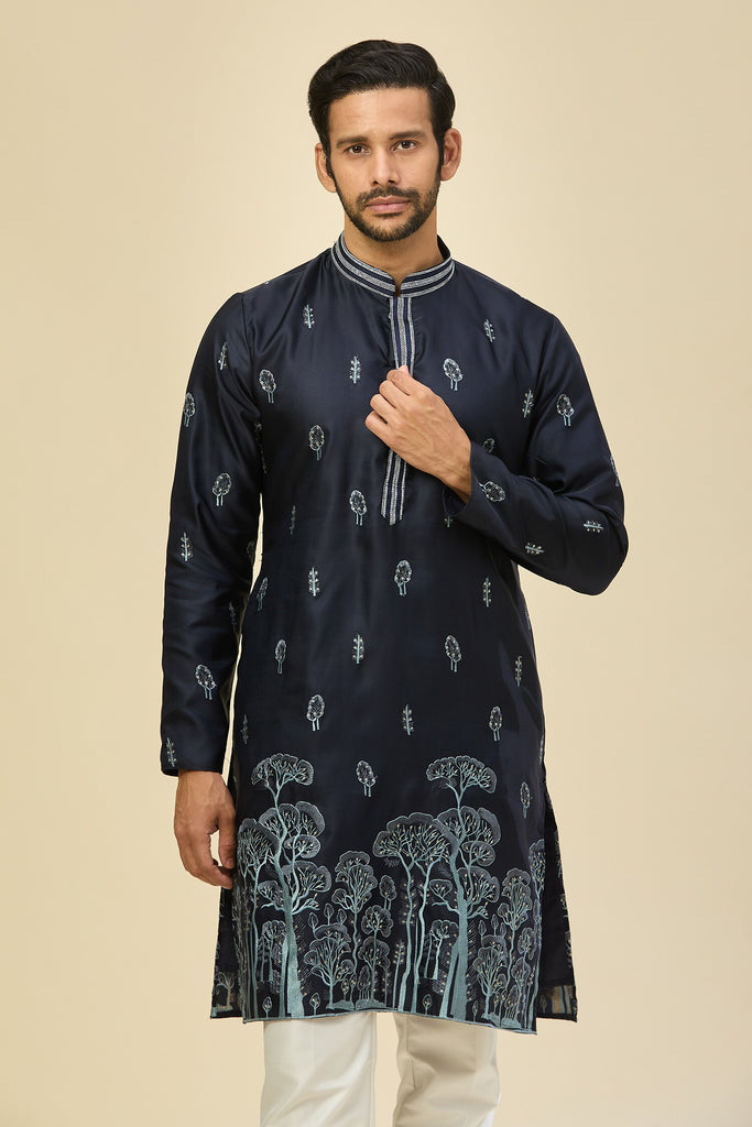 Royal Blue crepe silk based kurta enhanced with resham and sequins embroidery, paired with an off white dupion silk based mexican pants.