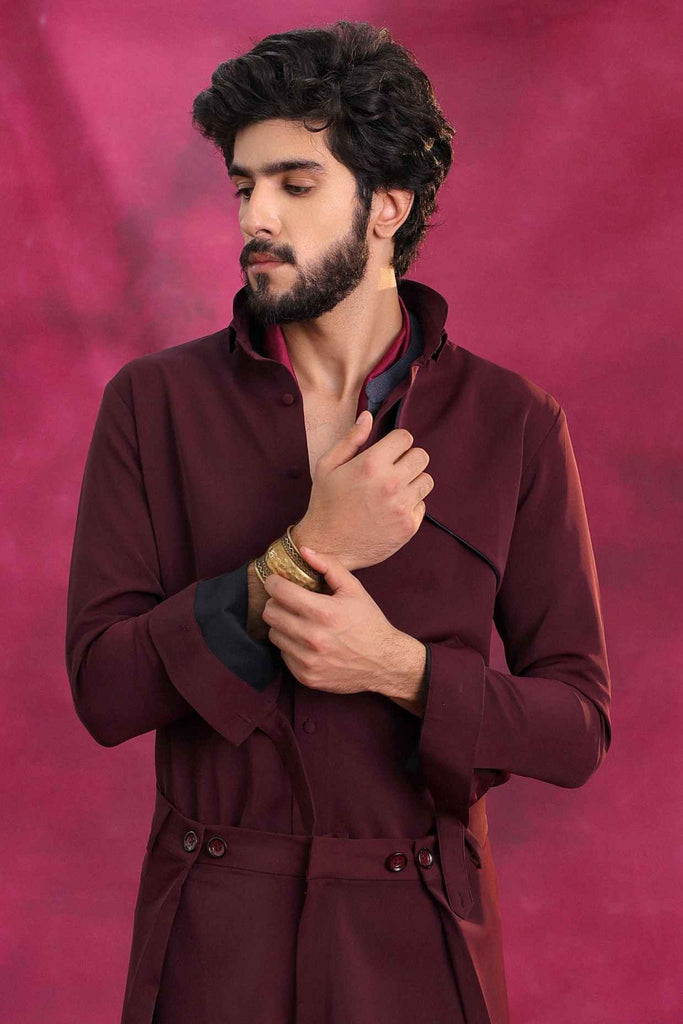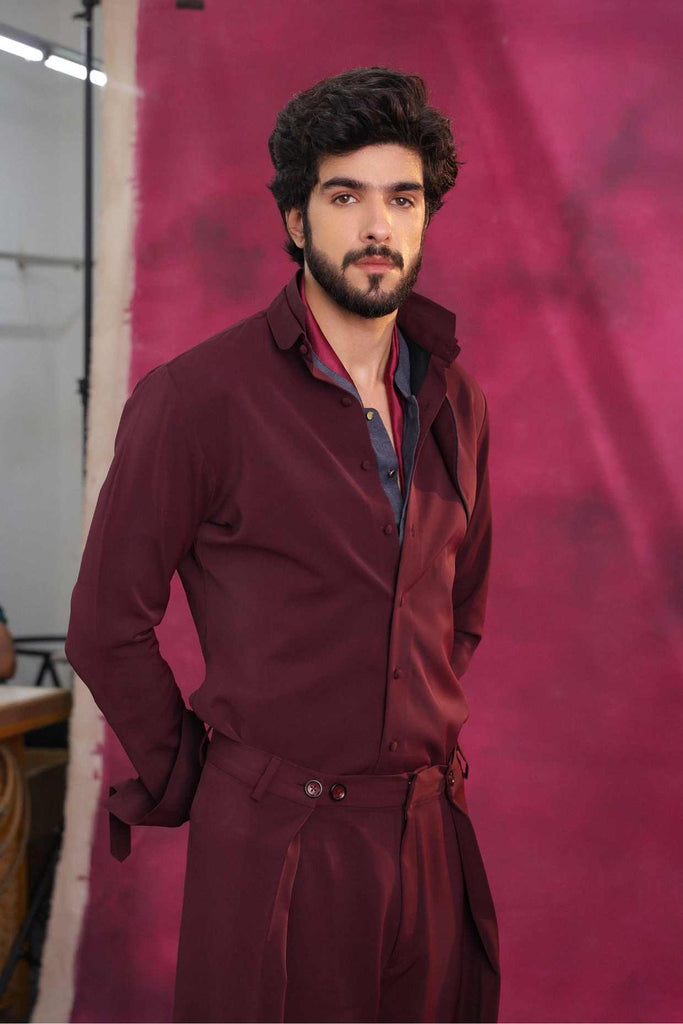 Presenting one of our latest Pretwear ensembles in a rich wine color — a 2-piece set featuring a tailored shirt with potli buttons and flap detailing. Paired with a tailored high-waist pleated trousers.