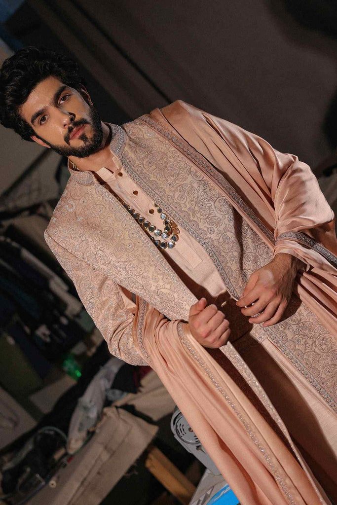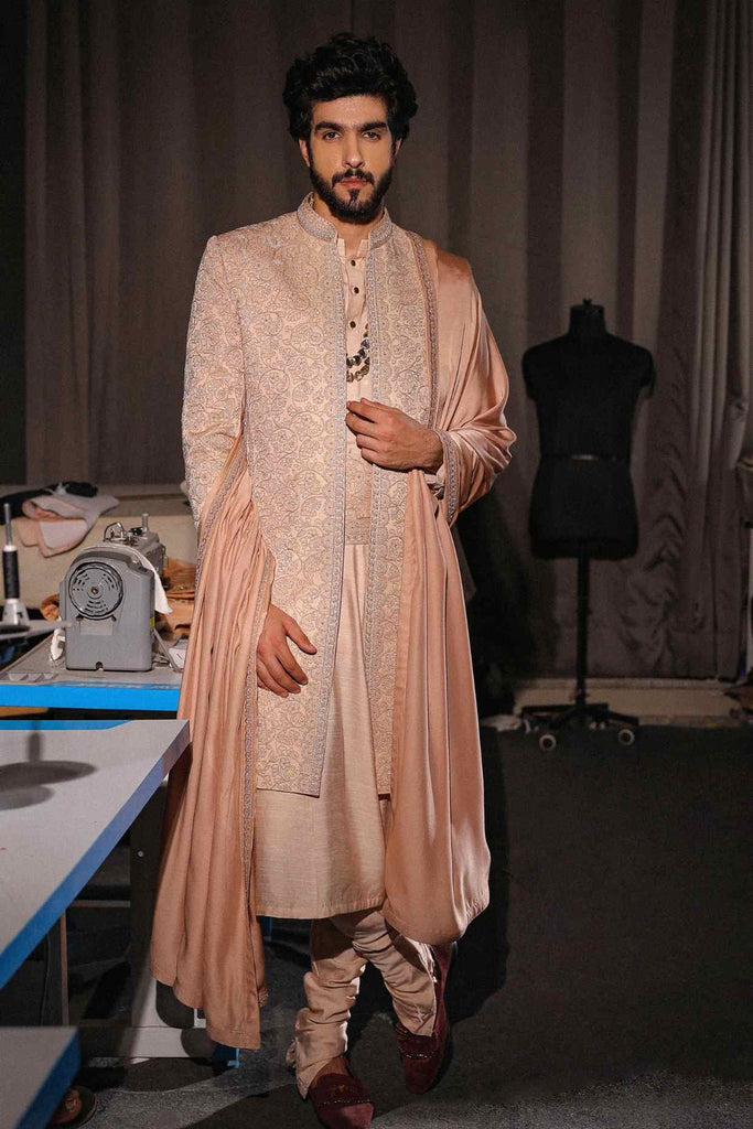 Featuring our work of art in our champagne sherwani set with all-over hand embroidery using tone-on-tone dori and katdana. Paired with a tone-on-tone kurta and churidar.