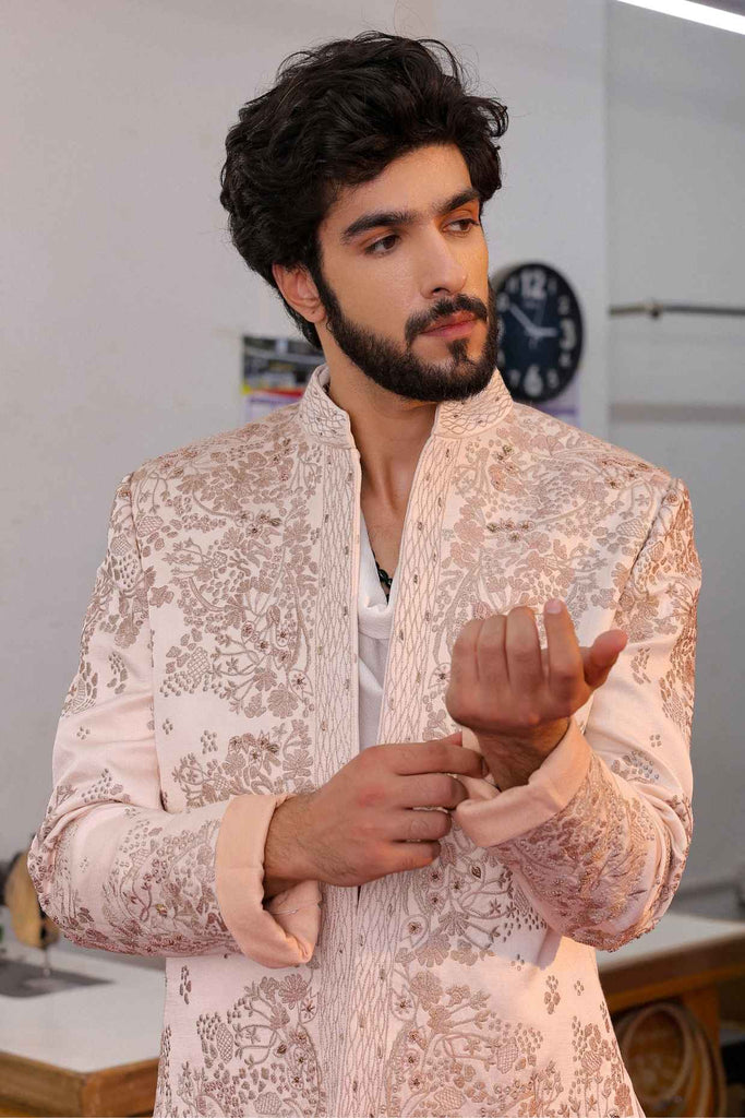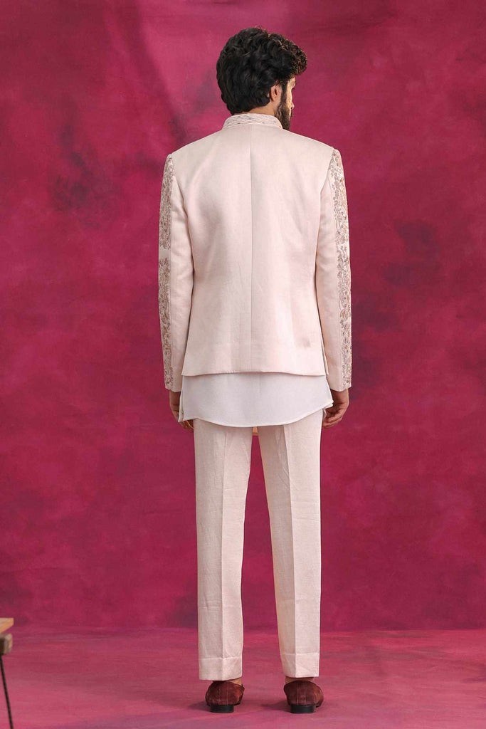 Presenting our Pastel Pink Bandhgala set on a linen silk base with intricate tone-on-tone embroidery all over. Paired with ivory tapered trousers.