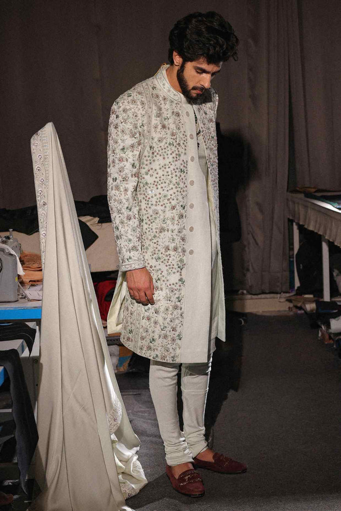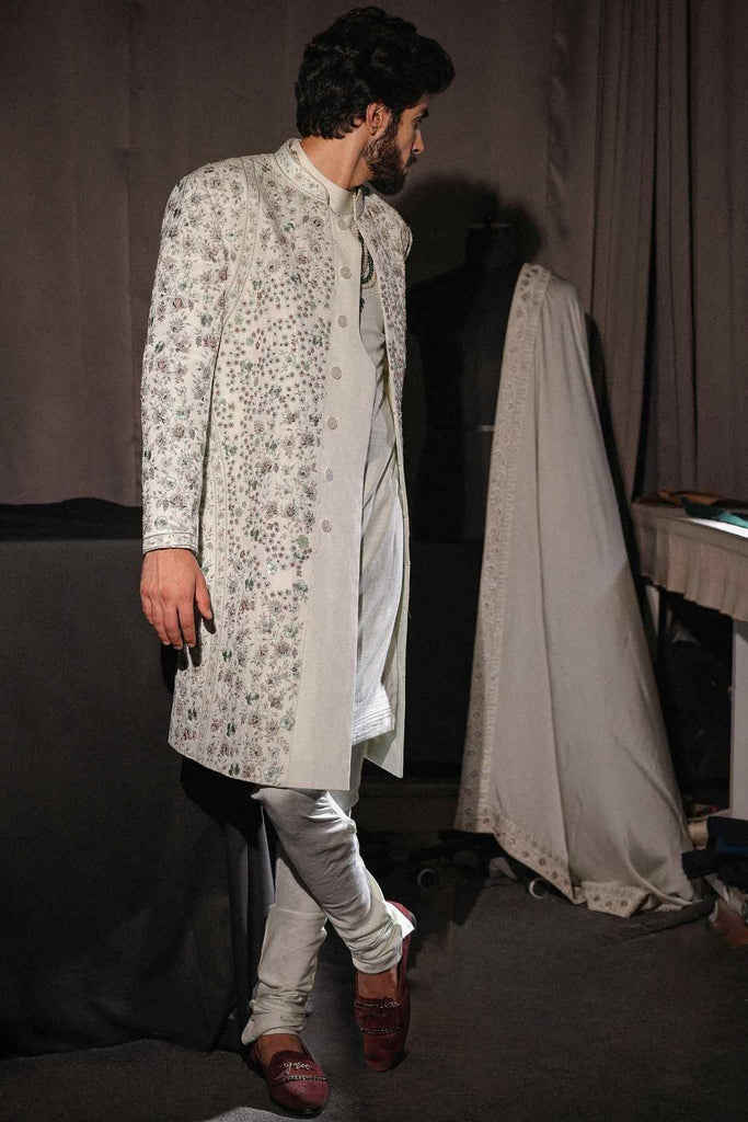 Presenting our work of art on a hazy blue linen silk base with hand embroidery techniques like aari and zardozi. Paired with a tone-on-tone kurta and churidar.