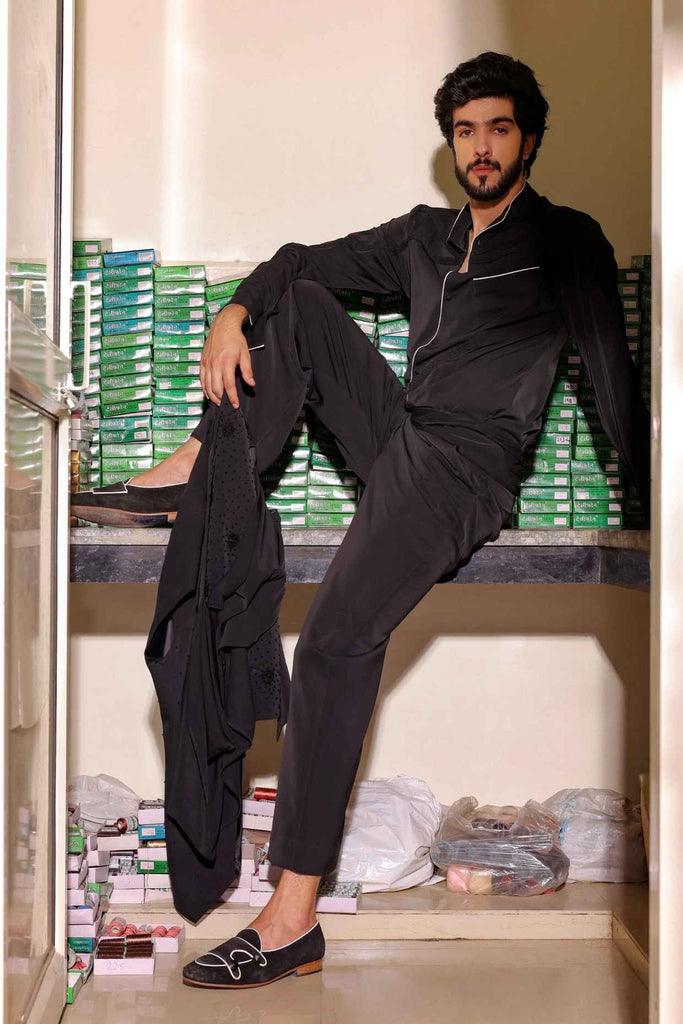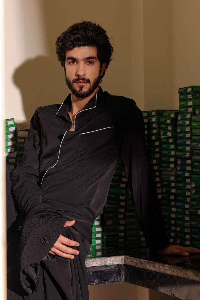 Presenting a classic black ensemble featuring a tailored shirt, trousers with an attached cummerbund, and a shacket with an elegant drape element bringing a touch of drama and fluidity.