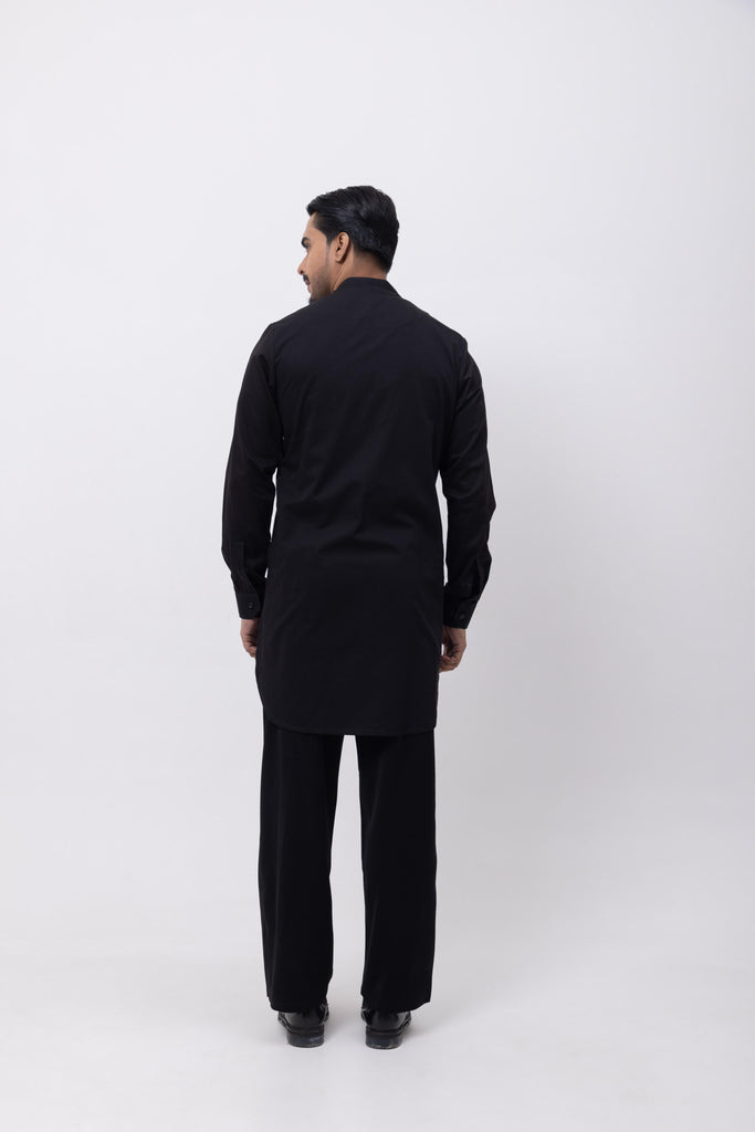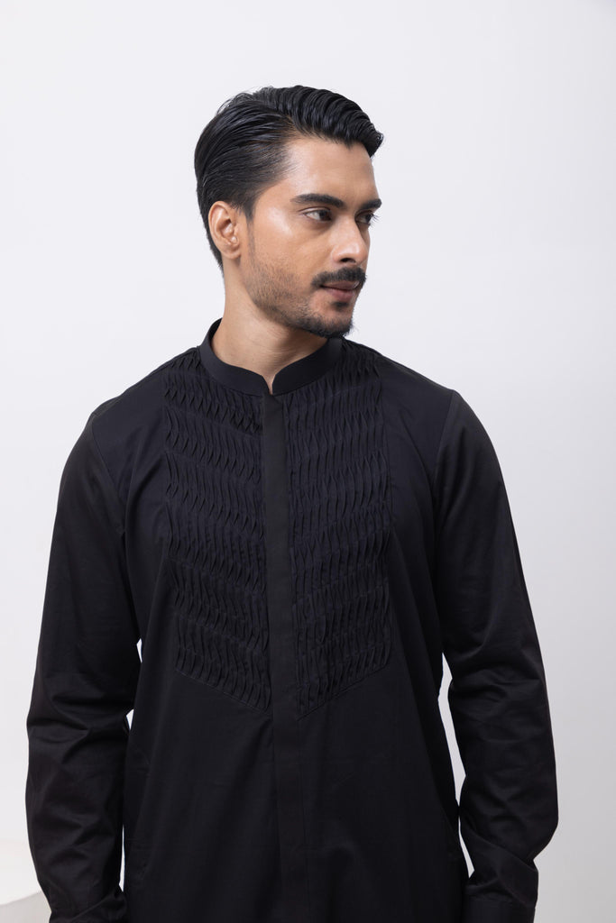 A Classic pintuck black kurta with detailing in front, you cant go wrong with when you want to make a statement! comfort like shirt , looks like kurta! best of boh world!