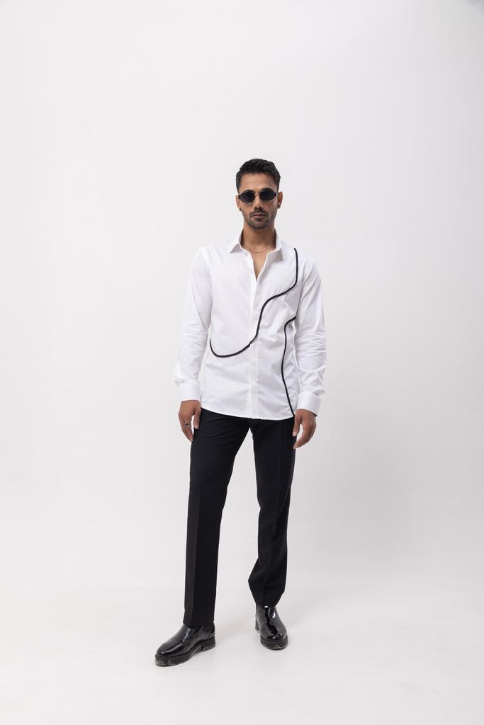 Minimal but not meek with this English cotton HAND EMBROIDERED DESIGNER SHIRT detailed with a bold black cord trail. A sleek standout for cocktail nights, gallery openings, or date hour