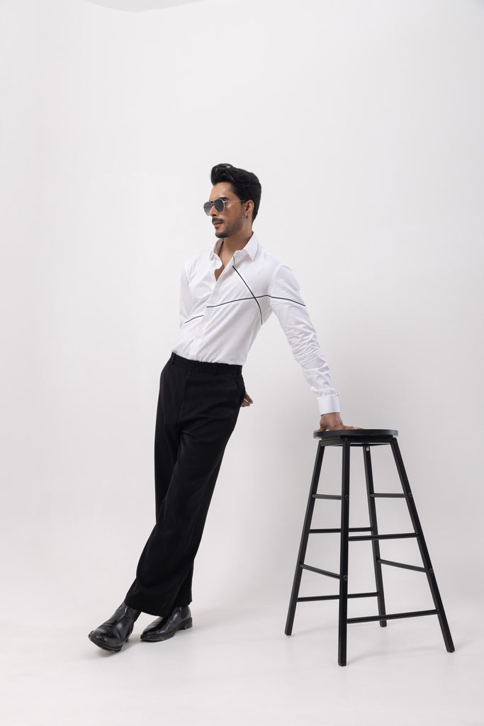 Precision meets polish with this English cotton HAND EMBROIDERED DESIGNER SHIRT featuring bold black cross-line detailing. Sleek, structured, and ready for evenings that matter
