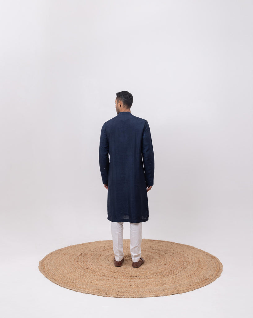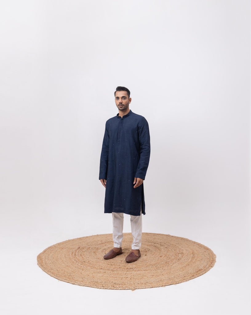 Embrace understated elegance with our Firefly Kurta Set. This isn't just a kurta; it's a statement. Crafted in a deep, midnight navy, this piece whispers sophistication with its subtle textured fabric and delicate, scattered bling embroidery – like stars against a twilight sky.