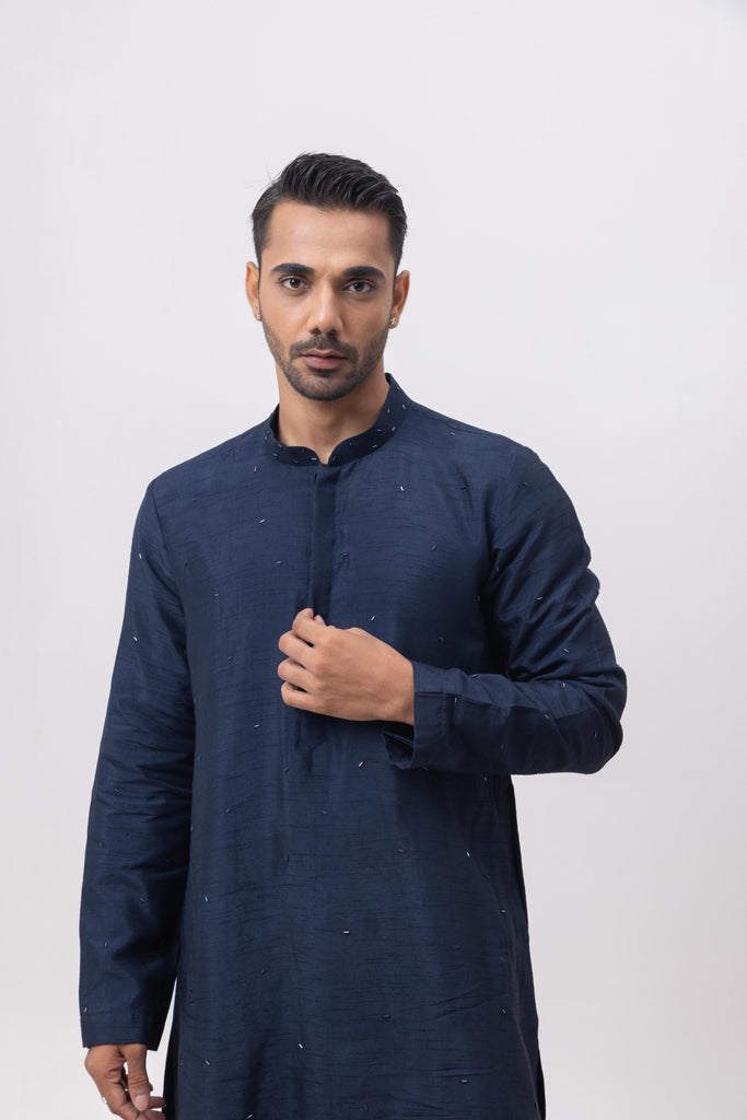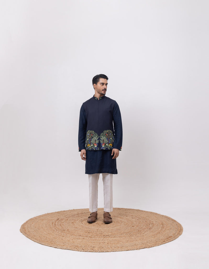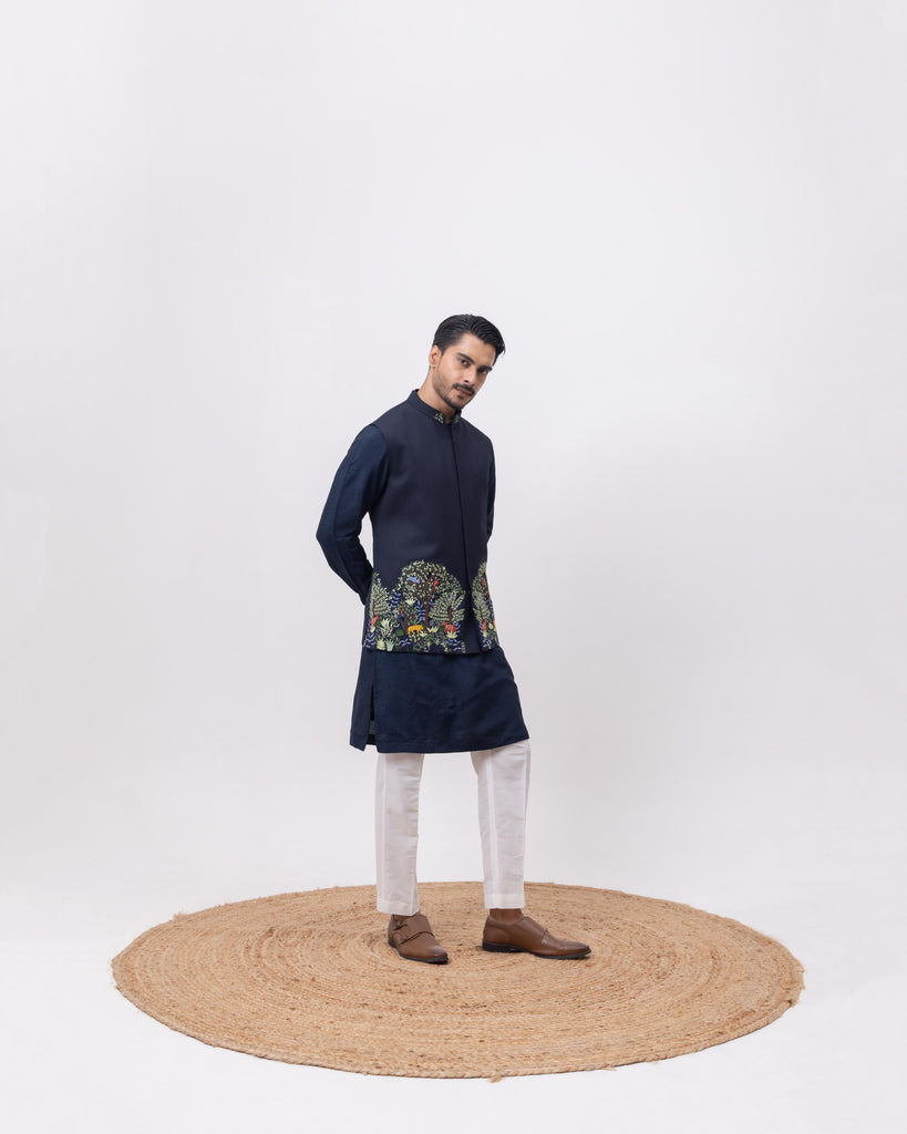 This navy Nehru jacket features detailed forest embroidery at the hem, lush trees, vibrant animals, and pops of color bringing mythic charm and bold elegance to festive wear. This includes a matching beautiful designer kurta set with details of embroidery added to wrists along with pants