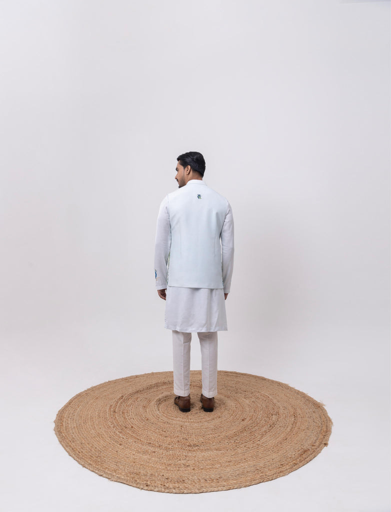 Introducing the exquisite Shreenath Nehru Jacket, a stunning piece that beautifully blends tradition with artistry! This elegant garment features intricate embroidery showcasing lush greenery and a vibrant depiction of Shreenathji, surrounded by nature's charm. The delicate detailing, from the peacocks to the floral motifs, adds a touch of elegance. Perfect for festive occasions or cultural celebrations, this piece is a true celebration of heritage and craftsmanship! (includes kurta and pants)