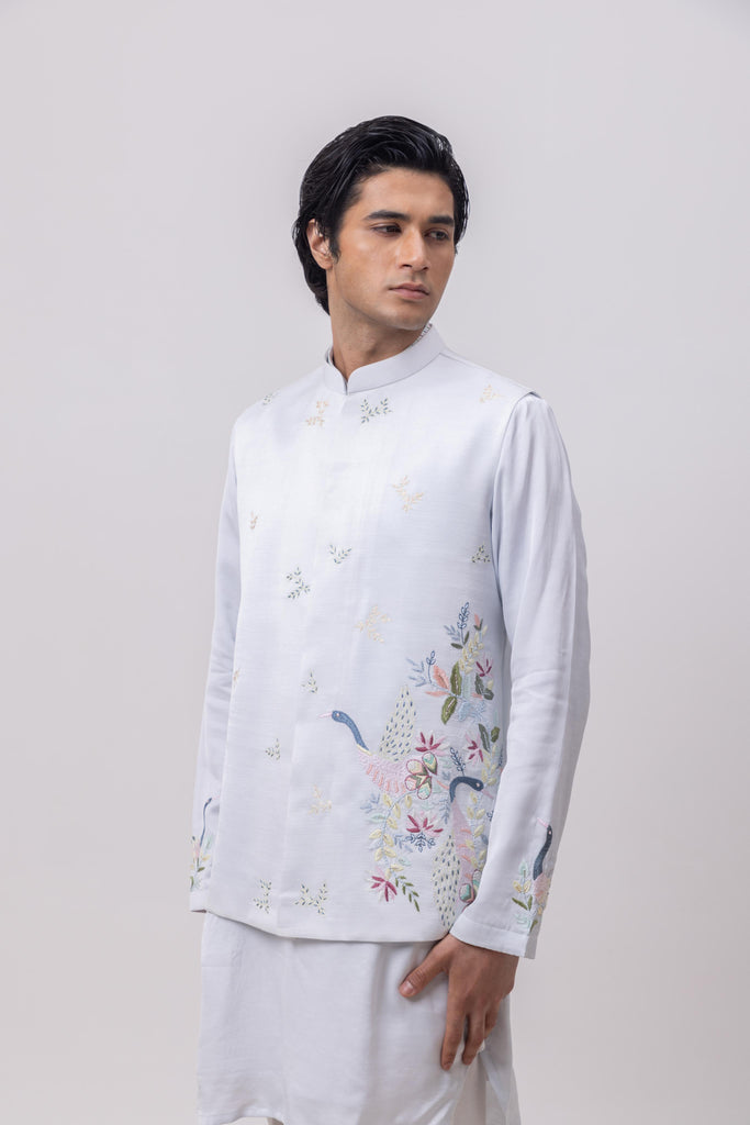 A serene Sky Blue Designer Nehru jacket delicately embroidered with dancing swans and floral motifs, placed with artistic restraint. The design breathes quiet luxury, with every thread telling a story of grace. Ideal for mehendis, engagement brunches, or understated festive gatherings