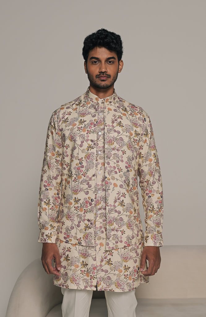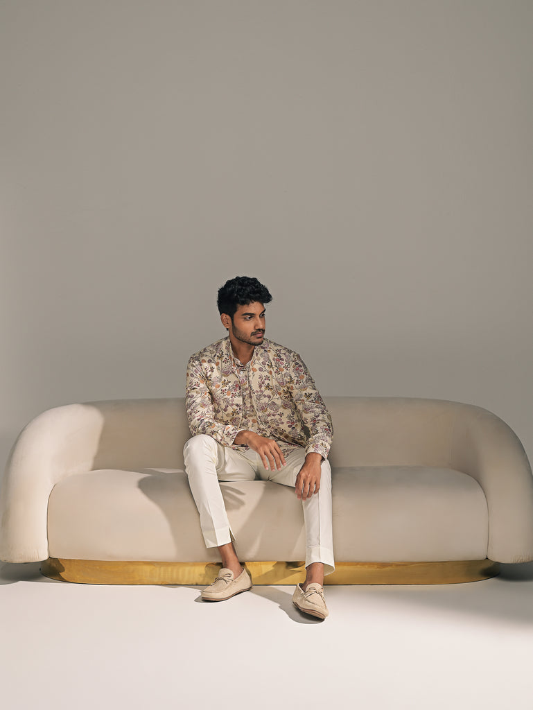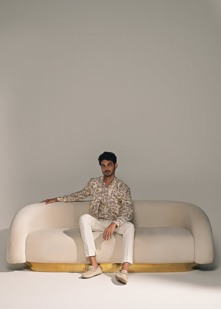 Open style off-white bandi in floral print featuring a mandarin collar, crafted from twill cotton fabric. Designed with a concealed inner pocket.