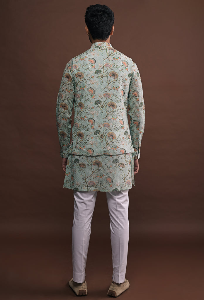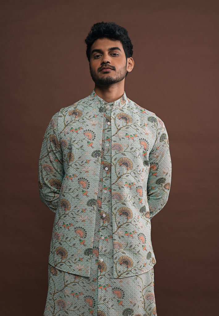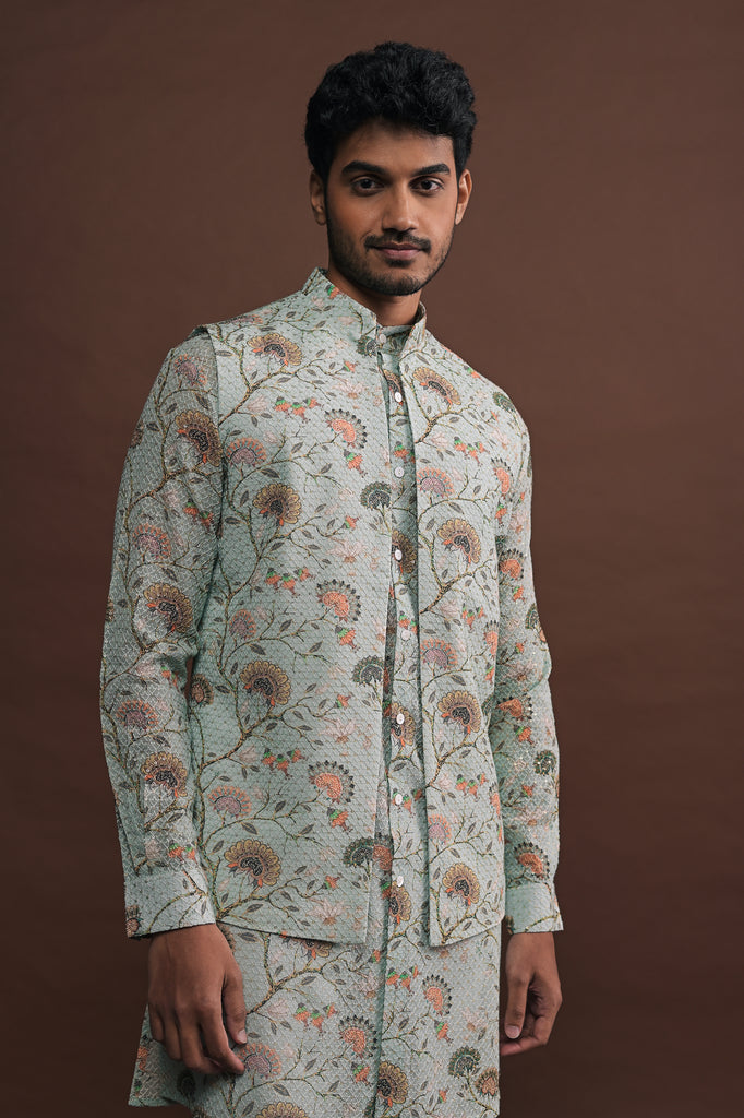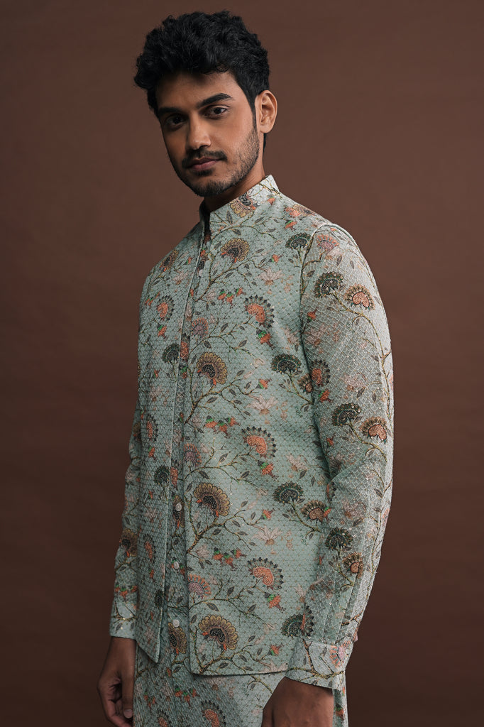 Seafoam green mandarin collar, open-style bandi in printed georgette fabric and all over sequin embroidery. The Bandi includes a concealed inner pocket for added functionality.