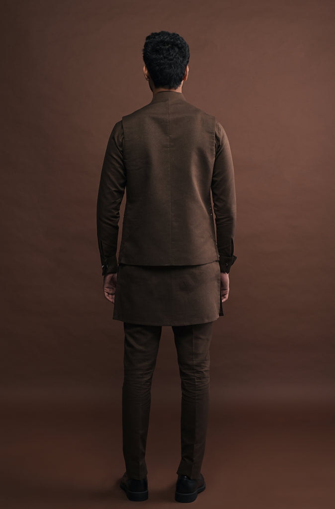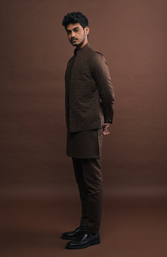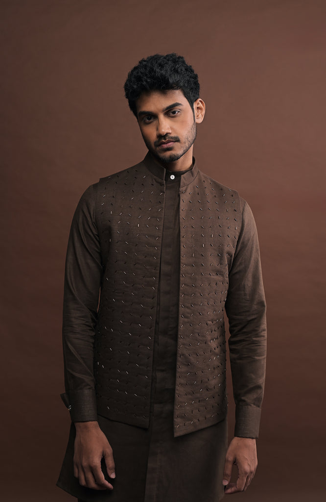 Open-style bandi in chocolate brown colour with cutdana embroidery and a mandarin collar. Crafted from cotton-linen, it features a concealed inner pocket for added functionality.