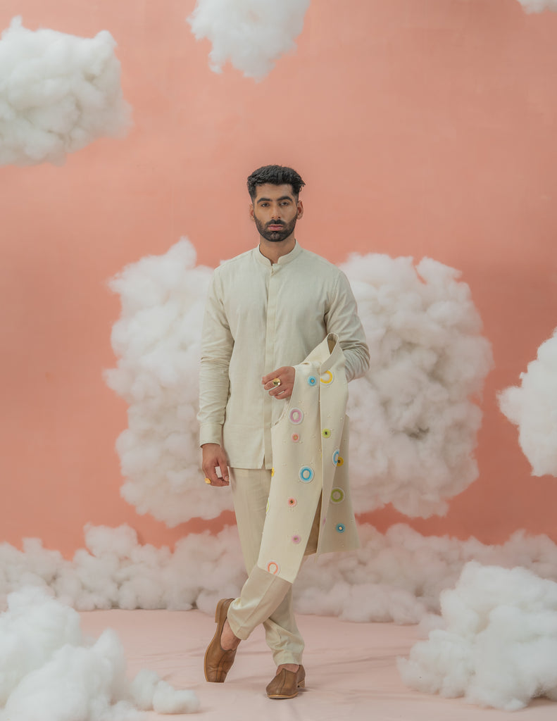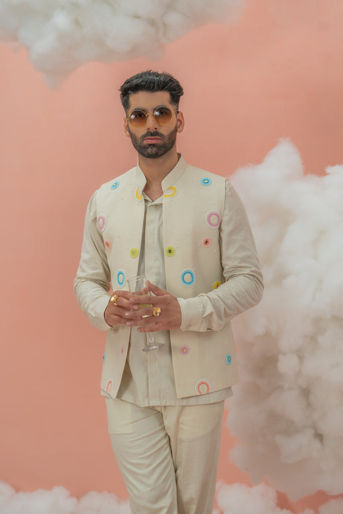 Beige being the color of sophistication, this kurta set epitomizes simplicity and fine tailoring . Coupled with the Carnival Linen bundi, its a complete set of vibrance with grace. The vivid colors in the bundi compliments the ingenuous surface of the kurta.