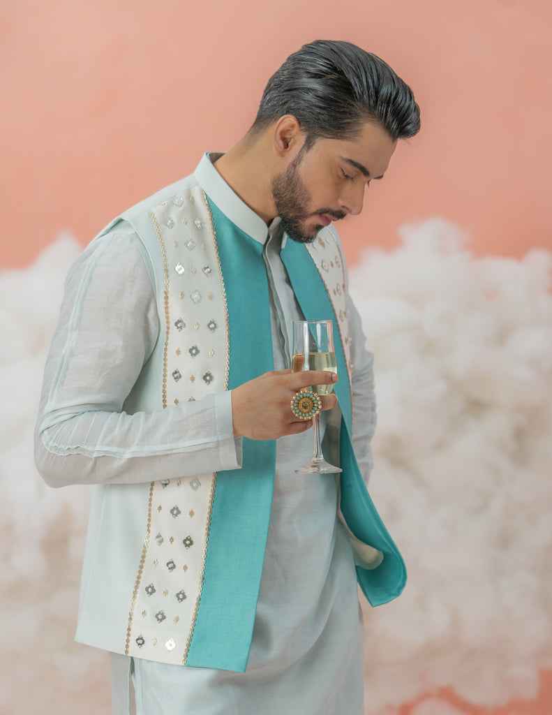 Our sparkle patch bundi is a bundle of shades of blue in silk with intricate embroidery enhancing the overall look. Its elegant and soothing look makes it a complete festive look.