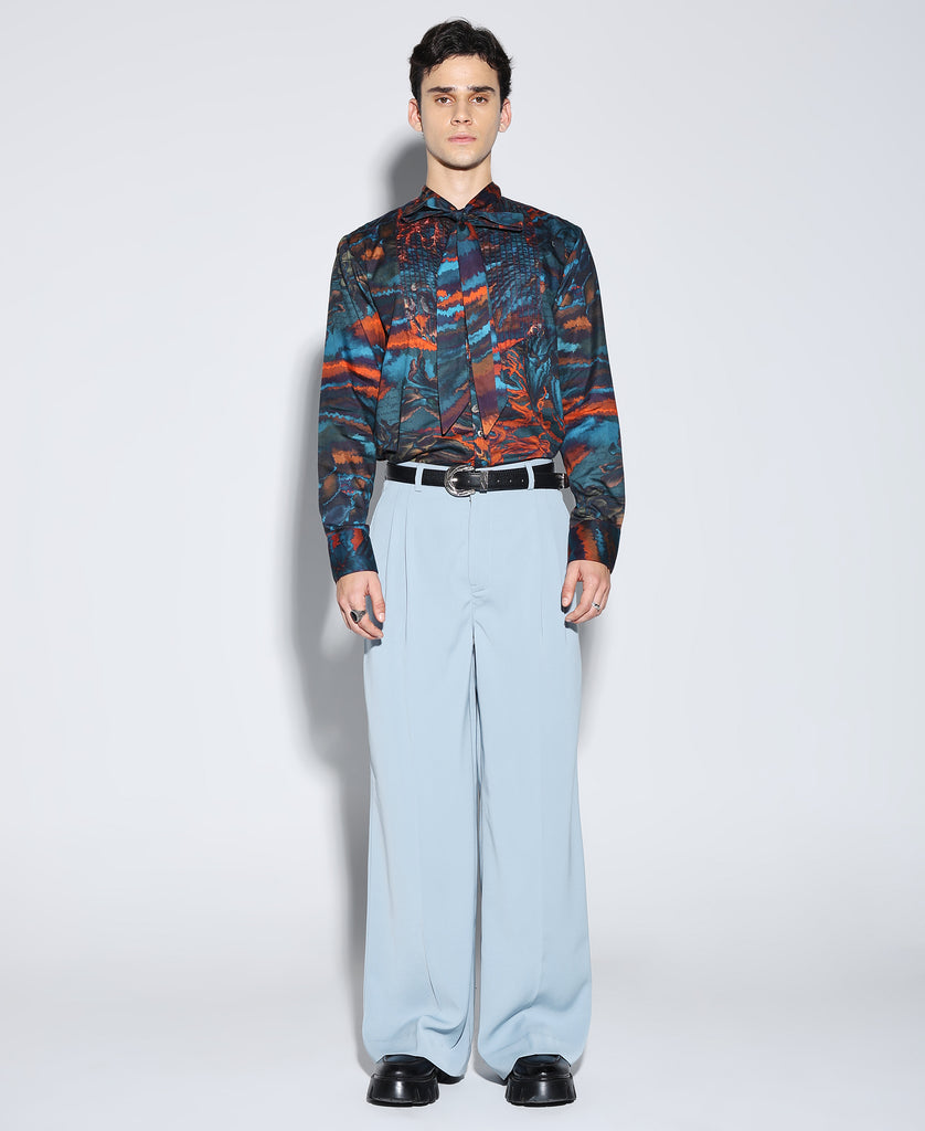 Digitally printed tailored shirt inspired by wild floral abstract comes with a pin tuck detailing on yoke. This shirt features a Tie-Up knot collar. The fit is relaxed.