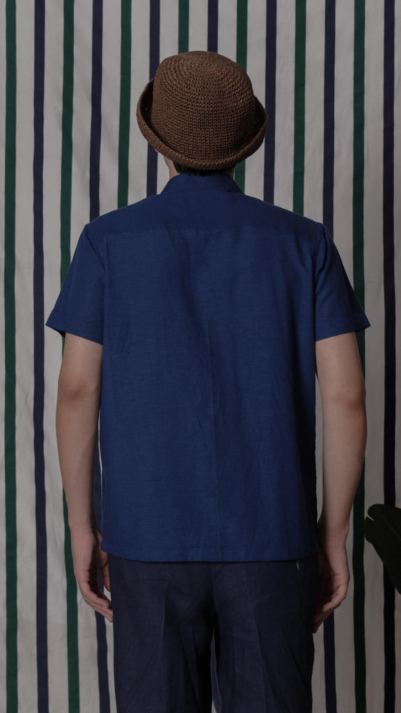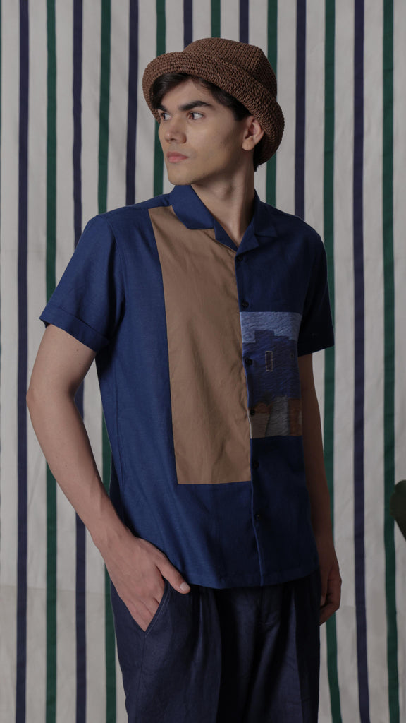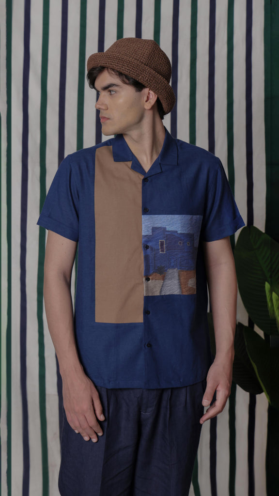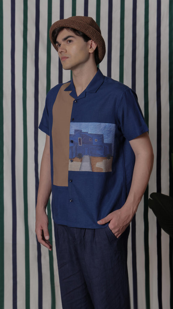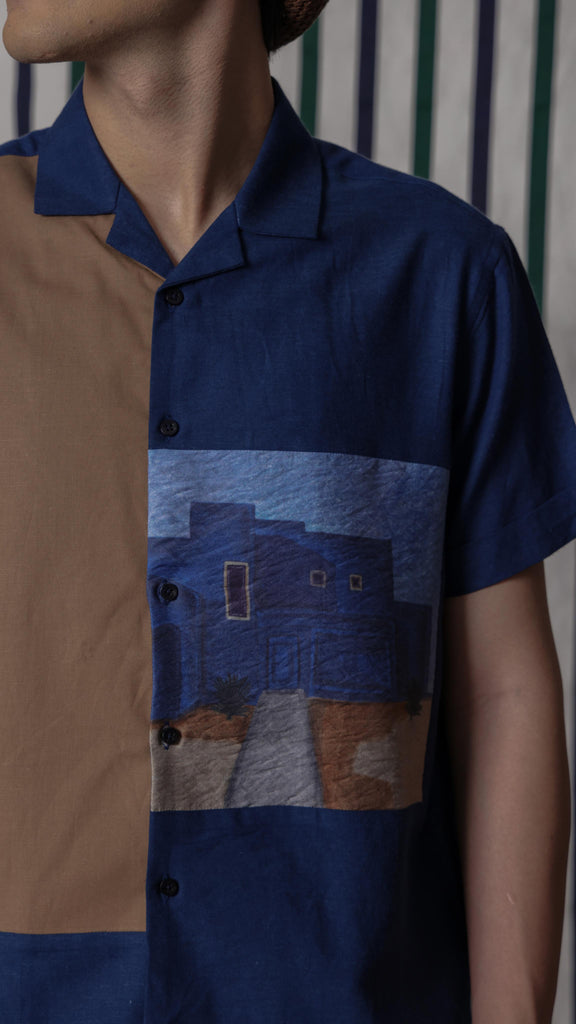 This half-sleeve cotton chambray shirt features a blue and tan print inspired by modern resort architecture, complemented by a camp collar and cut-and-sew tan panel detailing. Subtle buttons enhance its clean, artistic vibe.