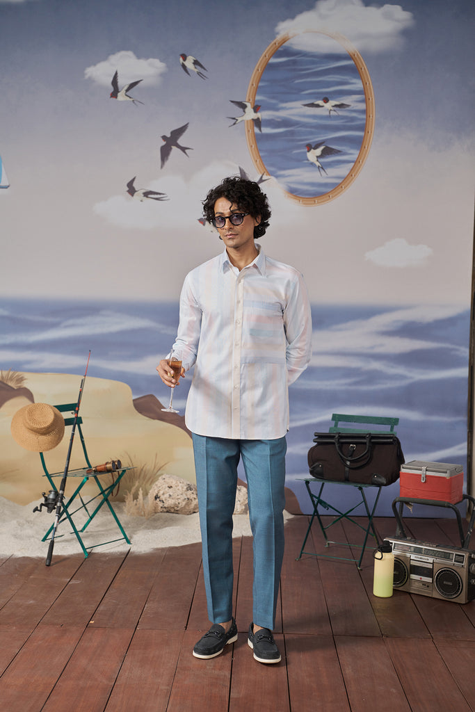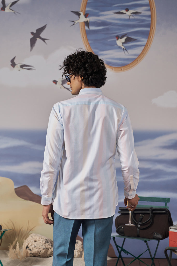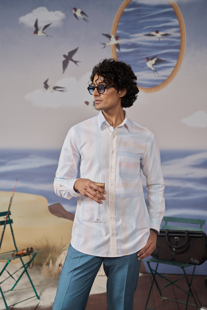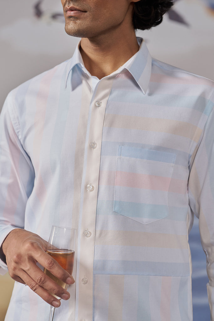 A crisp white shirt elevated with striped color blocking in soft pastel hues. Perfect for spring outings, casual workdays, or layering with light jackets for an effortlessly chic statement.