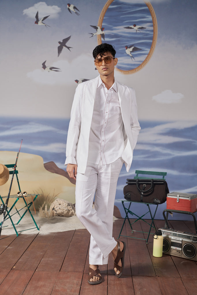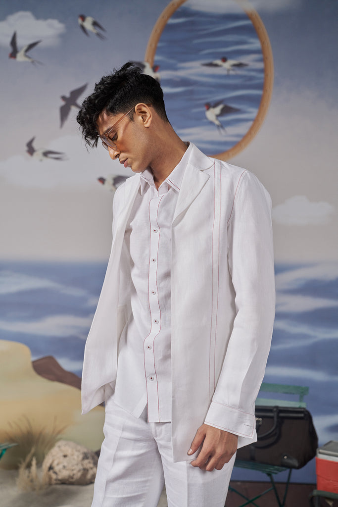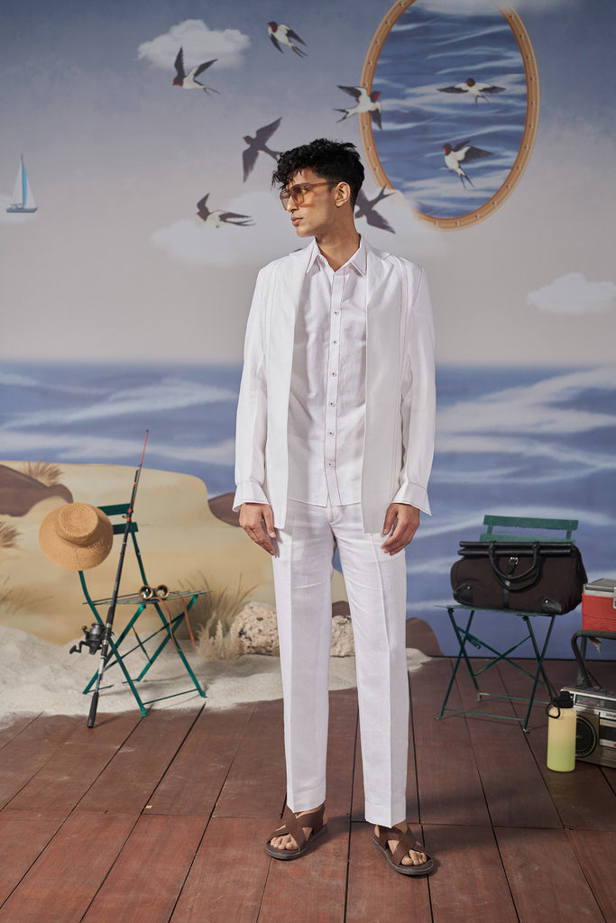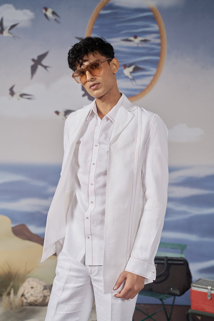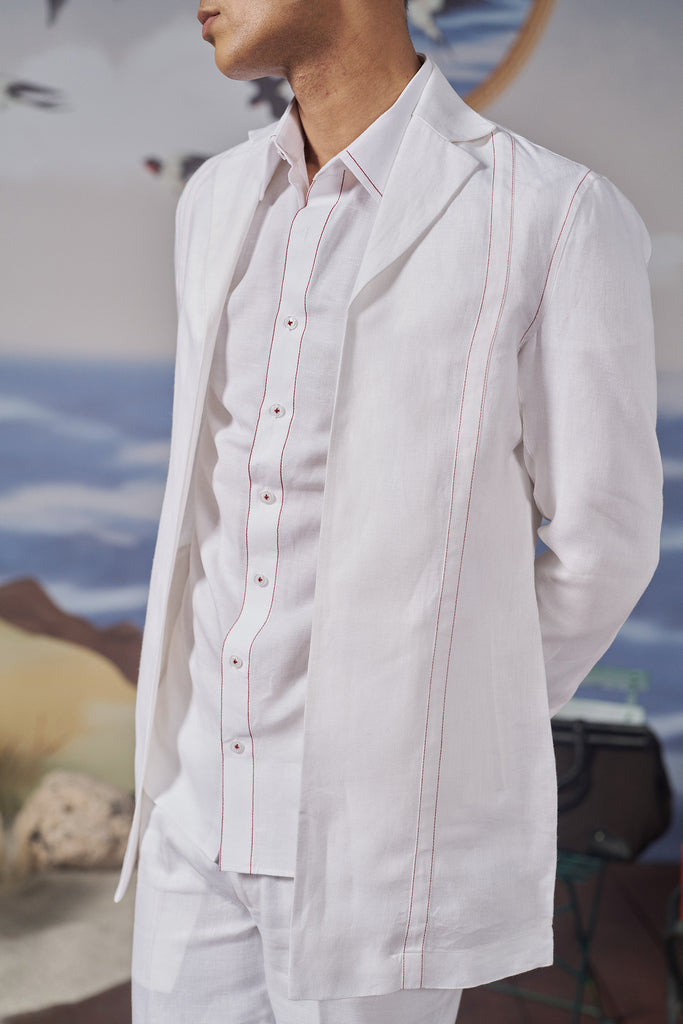 This classic white shirt features striking red topstitch detailing, offering a fresh and modern twist on a classic design. Its lightweight fabric ensures comfort, making it perfect for casual summer outings, brunches, or relaxed gatherings.​