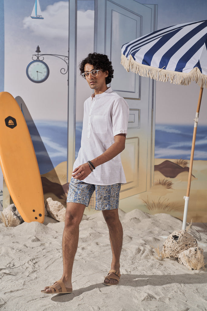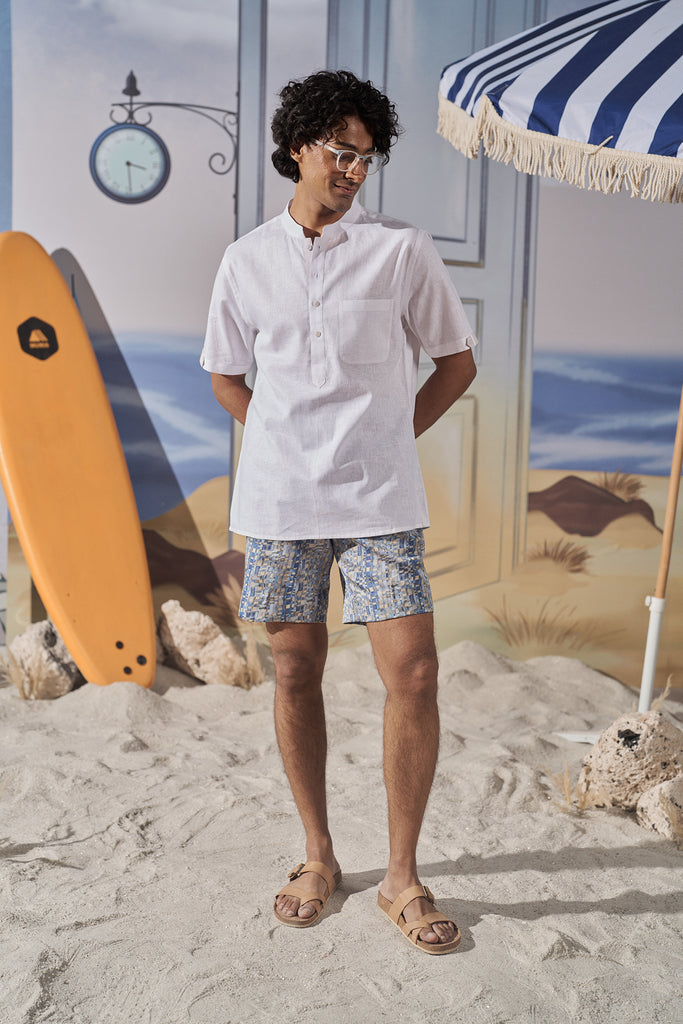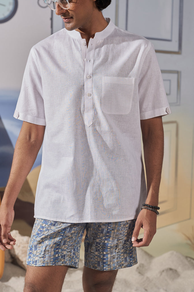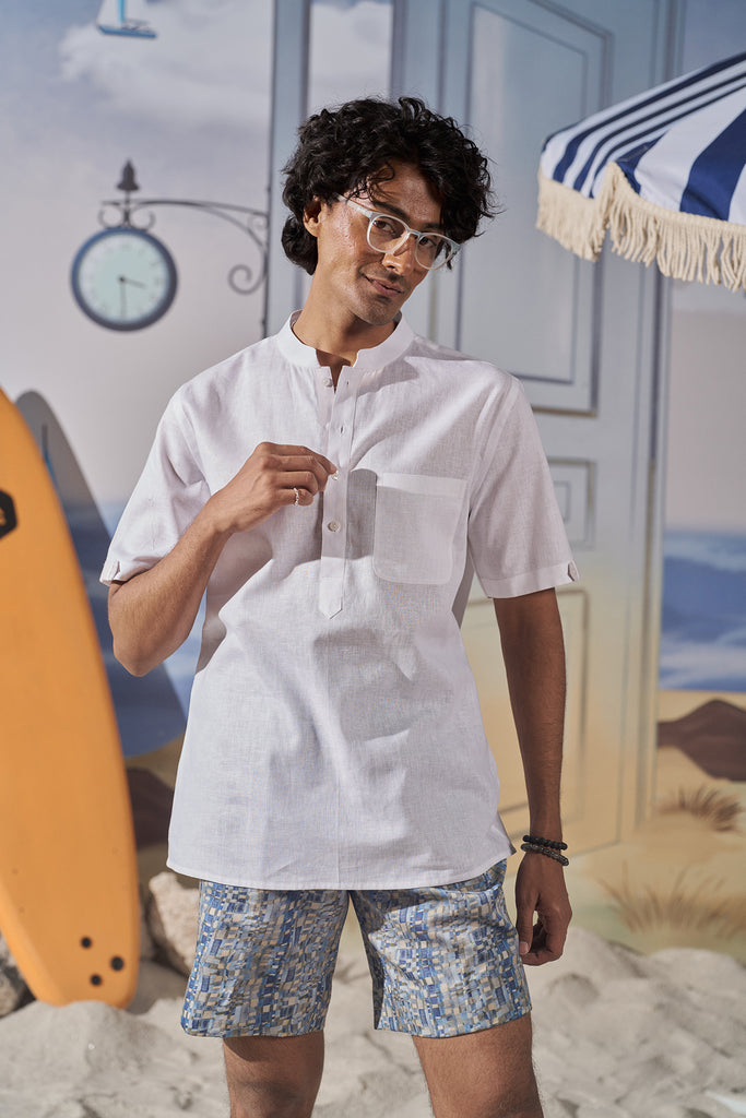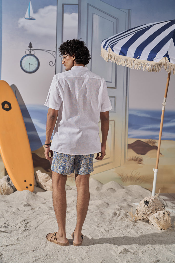 Light, fresh, and refined, this white linen half-sleeve shirt features delicate lavender detail on the sleeves and placket for a soft pop of color. Crafted from breathable, 100% linen fabric, it offers effortless comfort and a relaxed silhouette.