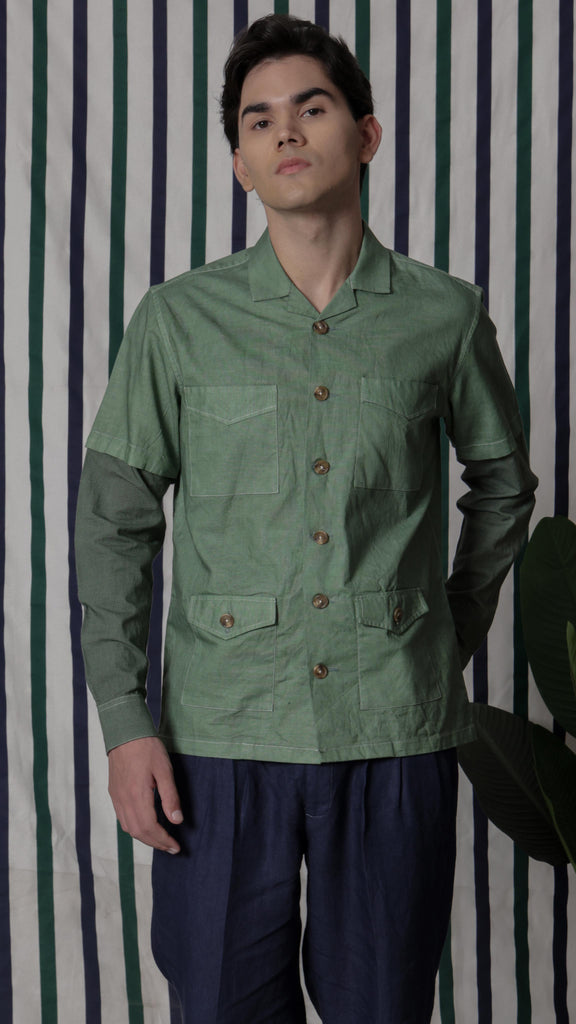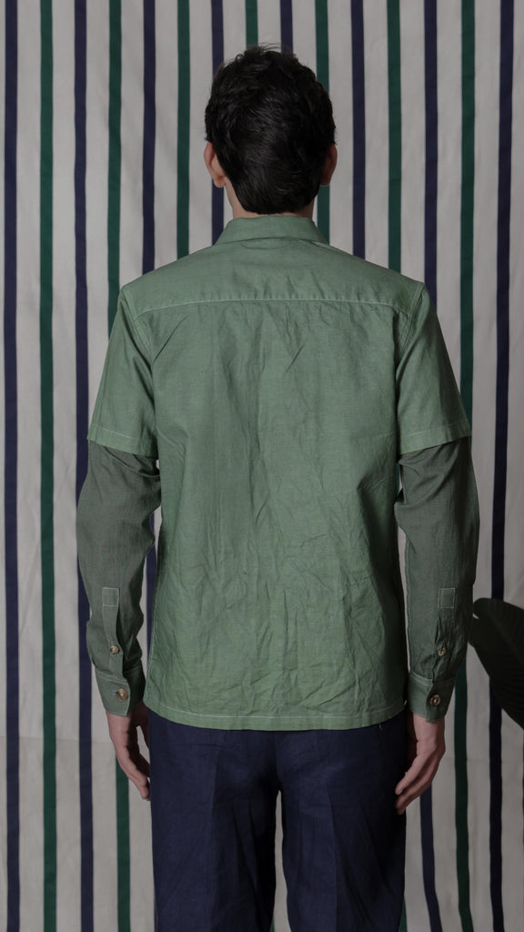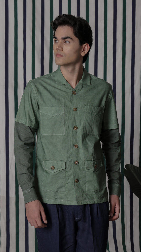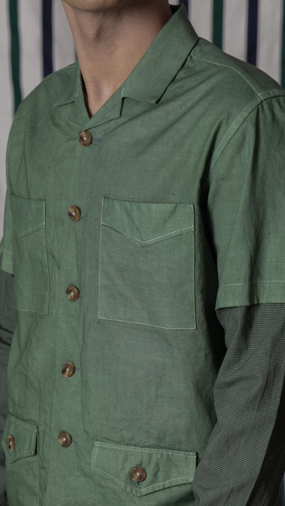 This full-sleeve cotton slub shirt comes in a rich green solid hue with a crushed texture, featuring a relaxed camp collar and contrasting striped sleeves. Statement pockets on the front and oversized buttons add a bold, utility-inspired edge. The textured fabric and playful detailing give it a laid-back yet elevated vibe. Style tip: Style it with neutral-toned trousers or denim and sneakers for an effortlessly cool, casual look.