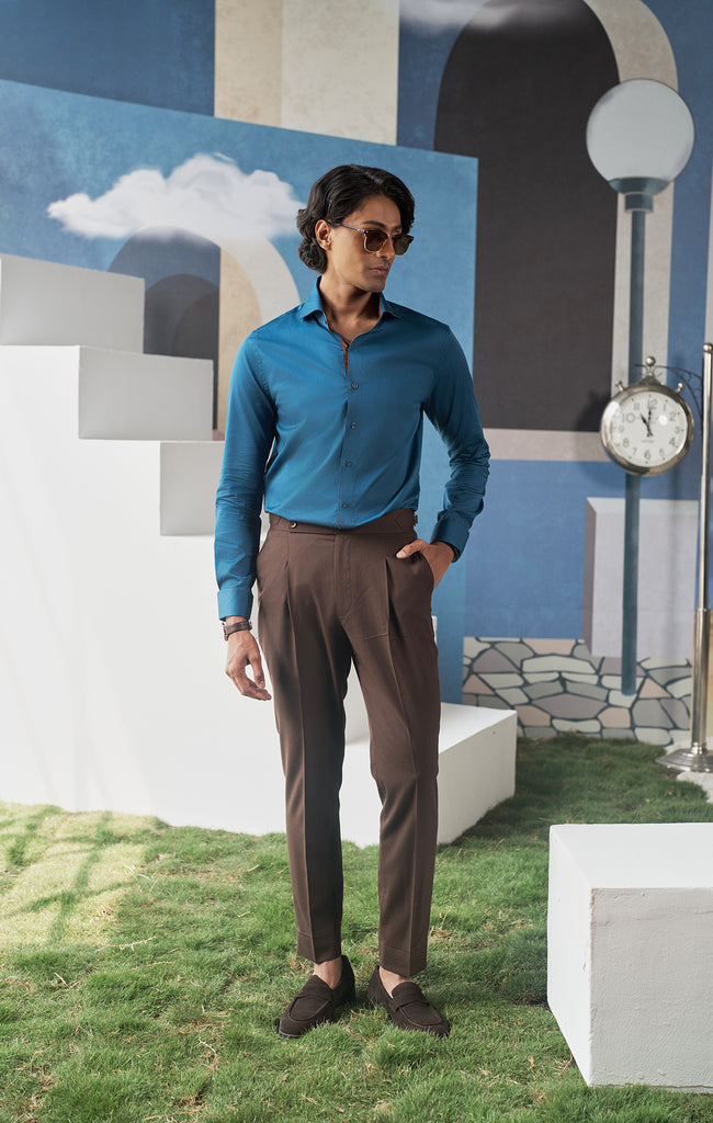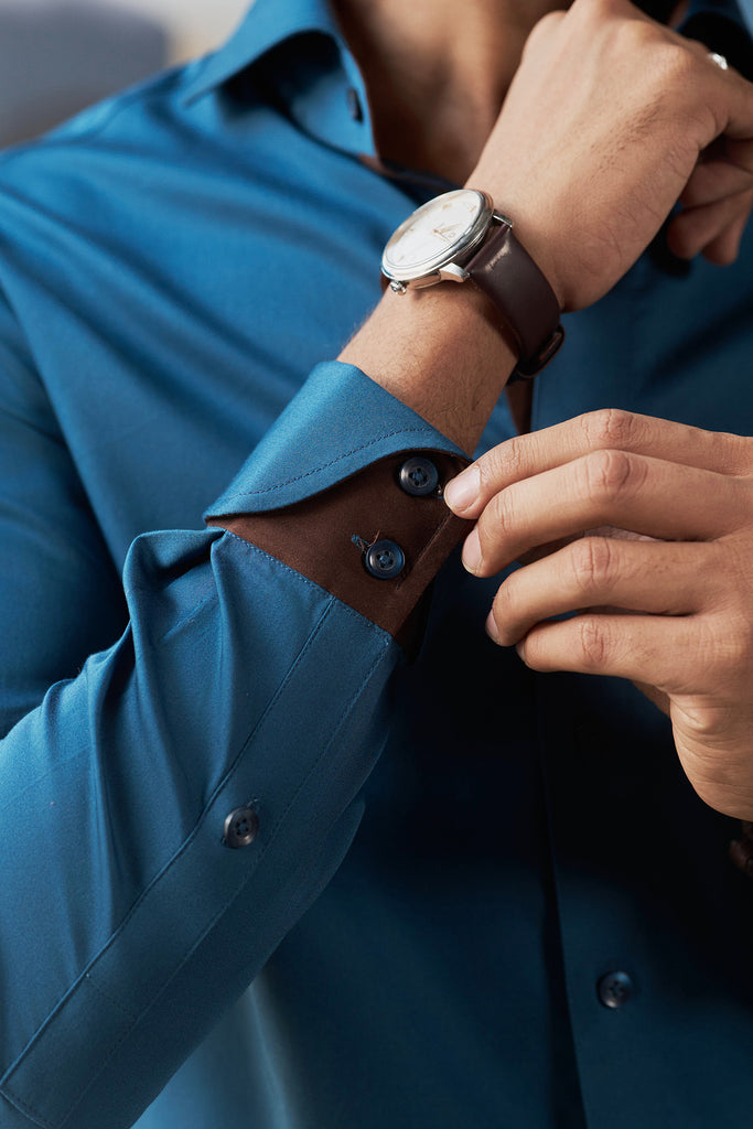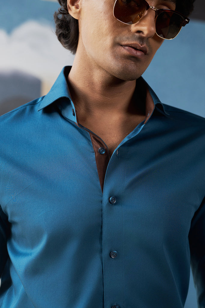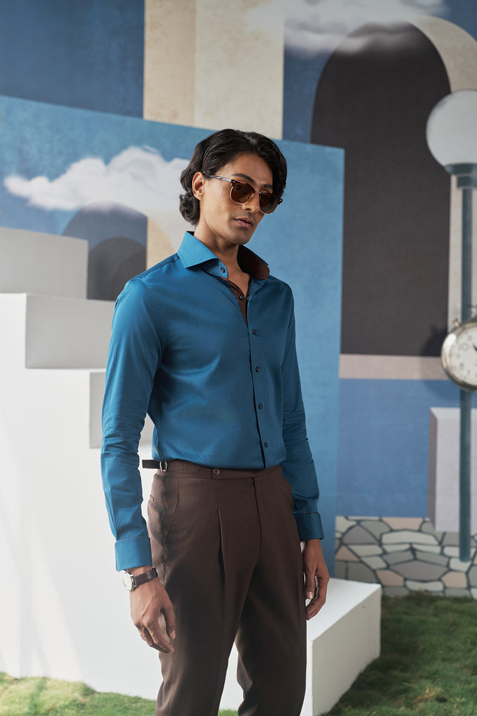 This blue shirt, with its distinctive cocktail cuffs and subtle brown-facing accents, speaks to the gentleman who commands attention without uttering a word. Crafted from premium fabric, it offers a sharp, tailored fit that moves with purpose and precision.