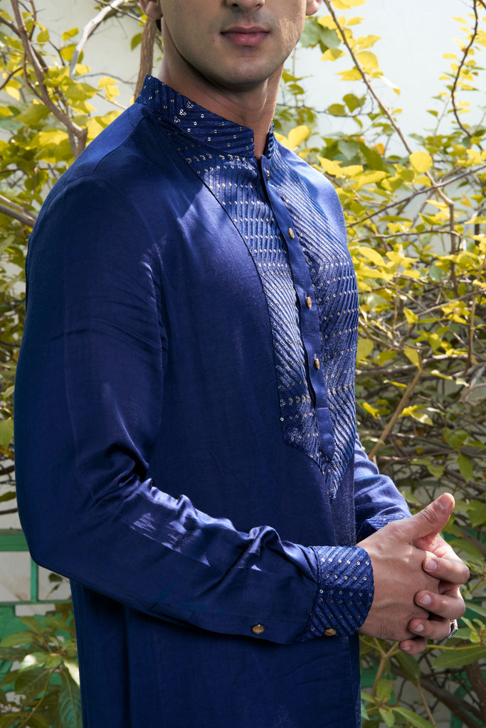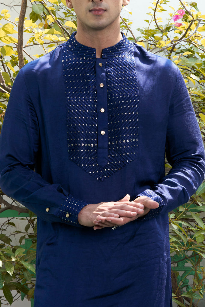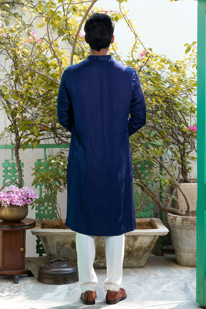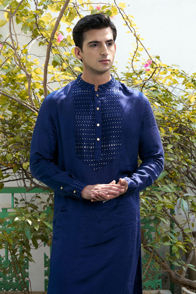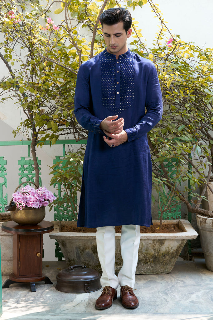 This deep blue linen satin kurta, with its intricate embroidery on the placket and cuffs, evokes a sense of calm and tranquility. Complete the look with white pants for an effortlessly chic ensemble.