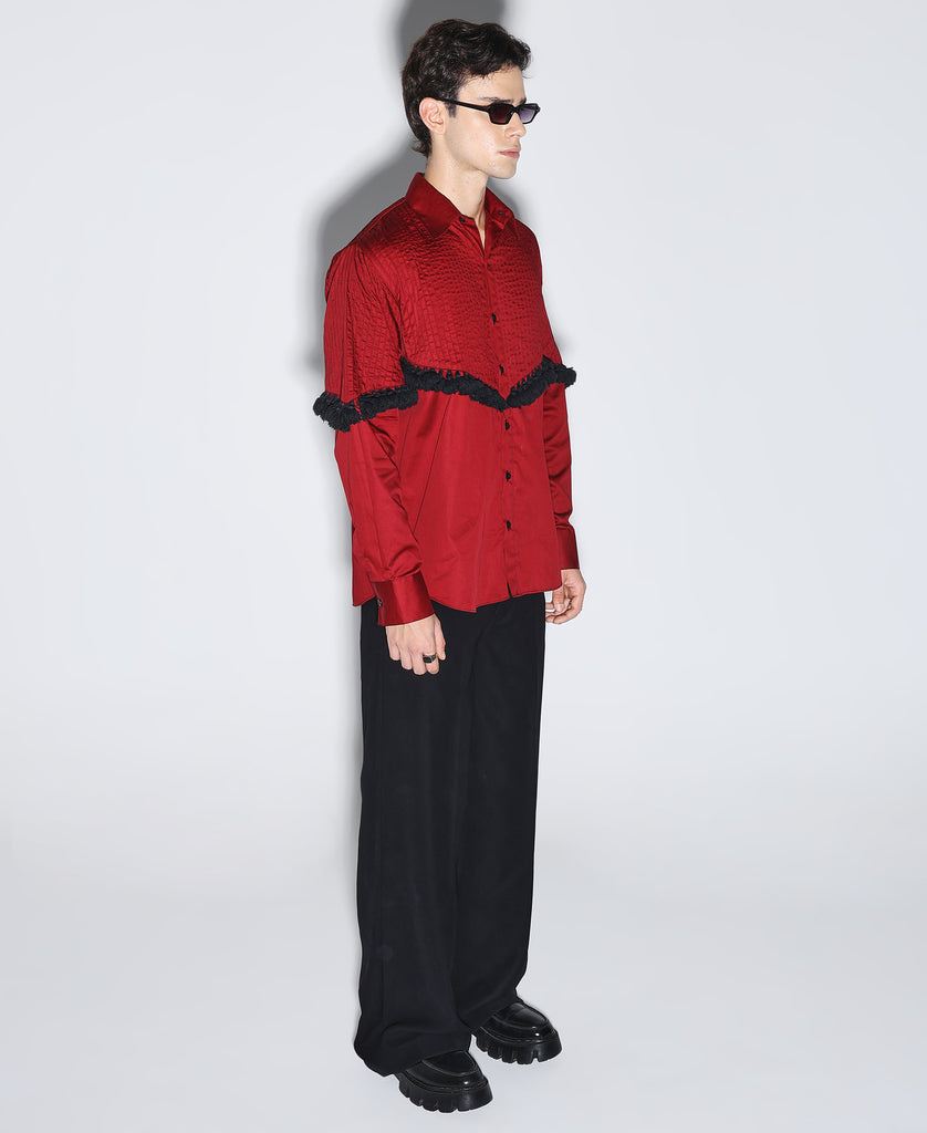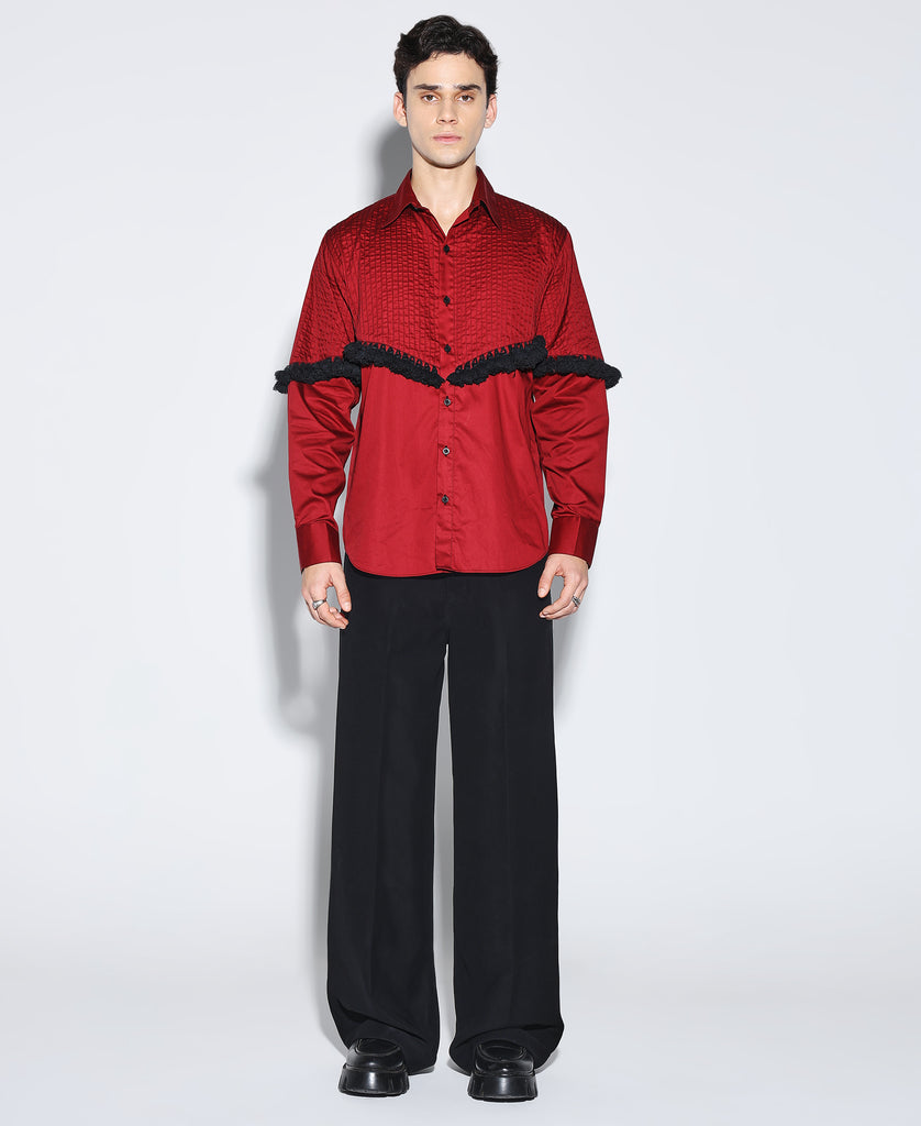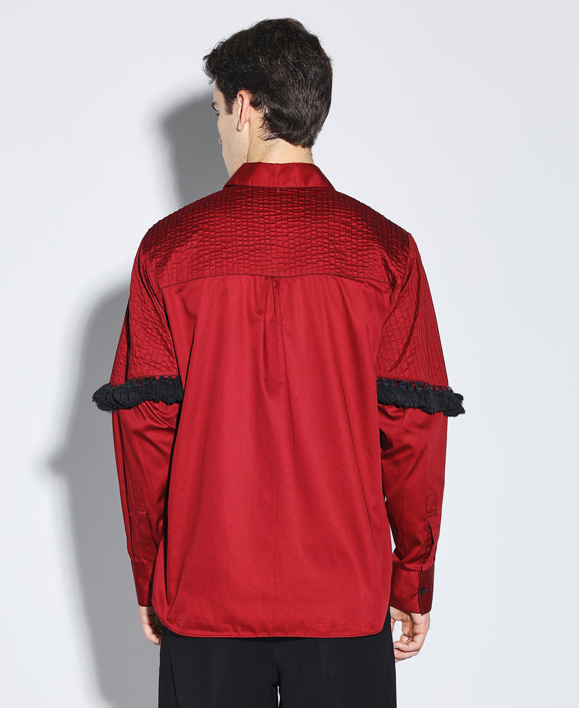 Crafted in a rich maroon hue with intricate pin tuck detailing across the front, sleeves & back. Tassel accents add a touch of refinement, creating a balance of structure and fluidity. This shirt is a work of art.